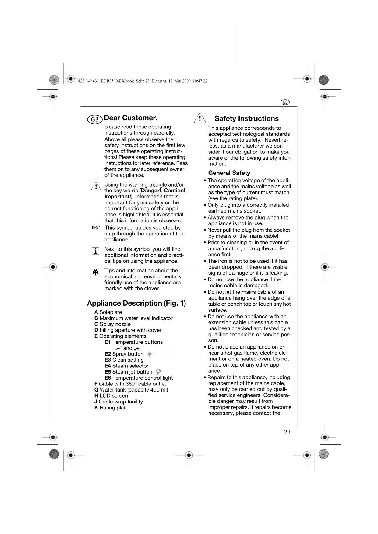 Dear Customer, please read these operating instructions through carefully. Above all please observe the safety instructions on the first few pages of these operating instruc-tions! Please keep these operating instructions for later reference. Pass them on to any subsequent owner of the appliance. Using the warning triangle and/or the key words (Danger!, Caution!, Important!), information that is important for your safety or the correct functioning of the appli-ance is highlighted. It is essential that this information is observed. 0 This symbol guides you step by step through the operation of the appliance. Next to this symbol you will find additional information and practi-cal tips on using the appliance. Tips and information about the economical and environmentally friendly use of the appliance are marked with the clover. Appliance Description (Fig. 1) A SoleplateB Maximum water level indicatorC Spray nozzleD Filling aperture with coverE Operating elementsE1 Temperature buttons „–“ and „+“E2 Spray buttonE3 Clean settingE4 Steam selectorE5 Steam jet buttonE6 Temperature control lightF Cable with 360° cable outletG Water tank (capacity 400 ml)H LCD screenJ Cable wrap facilityK Rating plate 1 Safety Instructions This appliance corresponds to accepted technological standards with regards to safety. Neverthe-less, as a manufacturer we con-sider it our obligation to make you aware of the following safety infor-mation. General Safety • The operating voltage of the appli-ance and the mains voltage as well as the type of current must match (see the rating plate). • Only plug into a correctly installed earthed mains socket. • Always remove the plug when the appliance is not in use.• Never pull the plug from the socket by means of the mains cable! • Prior to cleaning or in the event of a malfunction, unplug the appli-ance first! • The iron is not to be used if it has been dropped, if there are visible signs of damage or if it is leaking.• Do not use the appliance if the mains cable is damaged. • Do not let the mains cable of an appliance hang over the edge of a table or bench top or touch any hot surface.• Do not use the appliance with an extension cable unless this cable has been checked and tested by a qualified technician or service per- son.