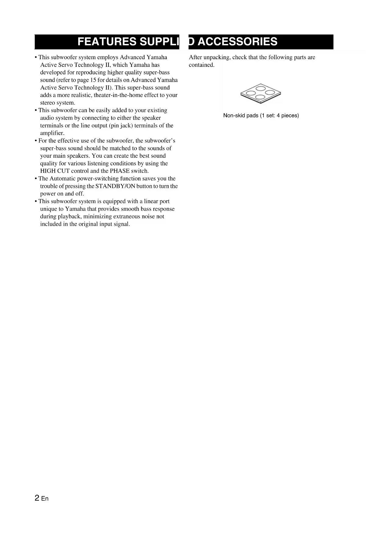 - This subwoofer system is equipped with a linear port unique to Yamaha that provides smooth bass response during playback, minimizing extraneous noise not included in the original input signal. After unpacking, check that the following parts are contained. Non-skid pads (1 set: 4 pieces) FEATURES SUPPLIED ACCESSORIES3 En English ( : subwoofer : main speaker) One subwoofer will have a good effect on your audio system, however, the use of two subwoofers is recommended to obtain more effect. If using one subwoofer, it is recommended to place it on the outside of either the right or the left main speaker (see A). If using two subwoofers, it is recommended to place them on the outside of each main speaker (see B). The placement shown in C is also possible, however, if the subwoofer system is placed directly facing the wall, the bass effect may die because the sound from it and the sound reflected by the wall may cancel out each other. To prevent this from happening, face the subwoofer system at an angle as in A or B. There may be a case that you cannot obtain enough super-bass sounds from the subwoofer when listening in the center of the room. This is because “standing waves” have been developed between two parallel walls and they cancel the bass sounds. In such a case, face the subwoofer obliquely to the wall. It also may be necessary to break up the parallel surfaces by placing bookshelves etc. along the walls. Use the non-skid pads Put the provided non-skid pads at the four corners on the bottom of the subwoofer to prevent the subwoofer from moving by vibrations etc. PLACEMENT