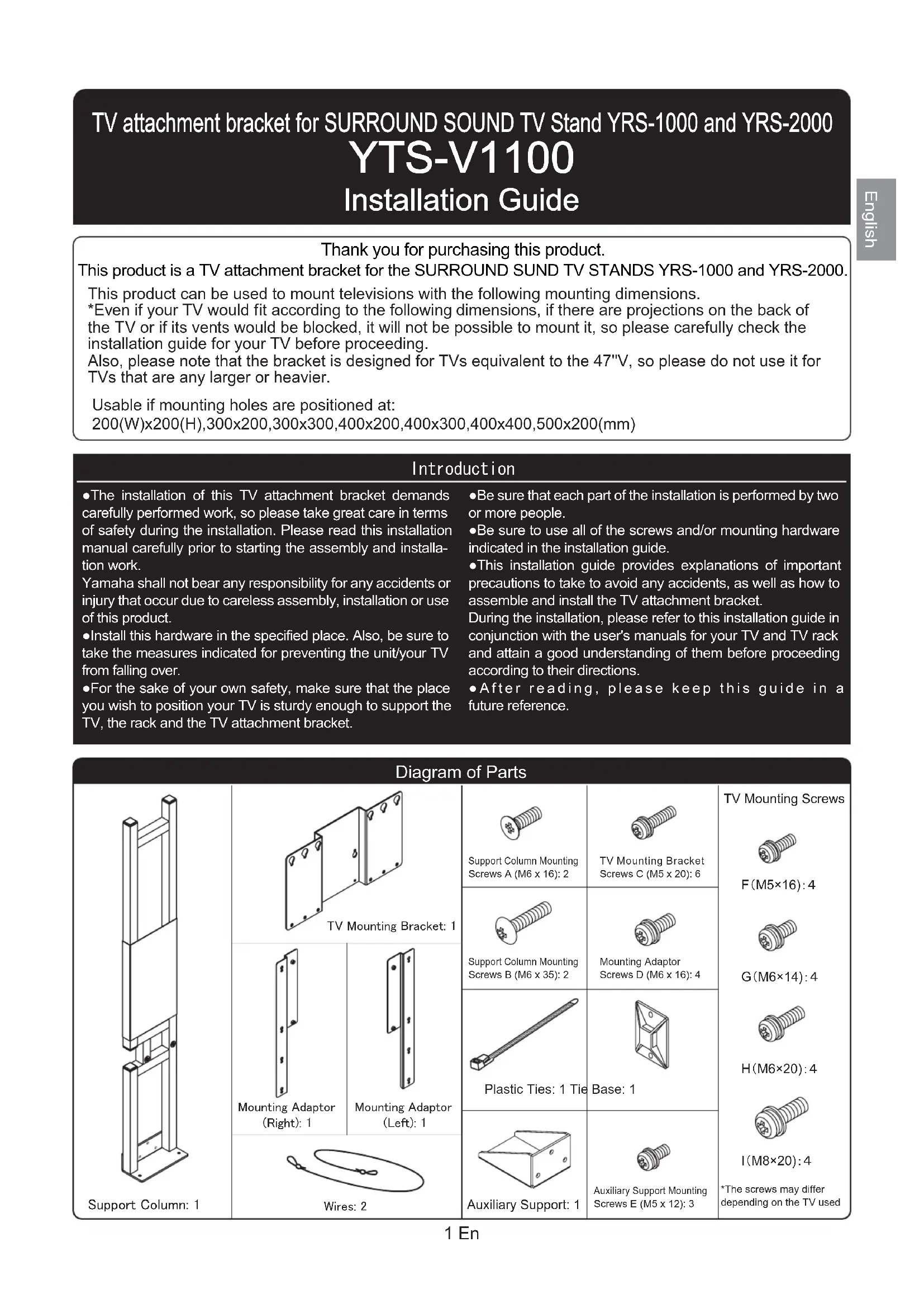 Schéma des dimensions Maßzeichnung Måttdiagram Disegni dimensionali Esquema de las Dimensiones Maattekening Чертеж с нанесенными размерами TV Mounting Bracket + Support Column Barre de montage pour TV + Colonne support TV-Halterung + Stützständer TV-monteringskonsoler + stödpelare Supporto di montaggio televisore + colonna di sostegno Placa Soporte de Montaje de la TV + Columna Soporte TV-montagebeugel + steunzuil Монтажный кронштейн телевизора + опорная стойка TV Mounting Bracket + Support Column + Mounting Adaptor Barre de montage pour TV + Colonne support + Adaptateur de montage TV-Halterung + Stützständer + Montageadapter TV-monteringskonsoler + stödpelare + monteringsadapter Supporto di montaggio televisore + colonna di sostegno + adattatore di montaggio Placa Soporte de Montaje de la TV + Columna Soporte + Adaptadores de Fijación TV-montagebeugel + steunzuil + montageadapter Монтажный кронштейн телевизора + опорная стойка + монтажный адаптер㪪㫌㫇㫇㫆㫉㫋㩷㪚㫆㫃㫌㫄㫅㪑㩷㪈Auxiliary Support: 1㪫㪭㩷㪤㫆㫌㫅㫋㫀㫅㪾㩷㪙㫉㪸㪺㫂㪼㫋㪑㩷㪈F䋨M5×16)䋺䋴H䋨M6×20)䋺䋴TV Mounting ScrewsI䋨M8×20)䋺䋴㪤㫆㫌㫅㫋㫀㫅㪾㩷㪘㪻㪸㫇㫋㫆㫉㩷㩿㪩㫀㪾㪿㫋㪀㪑㩷㪈㪤㫆㫌㫅㫋㫀㫅㪾㩷㪘㪻㪸㫇㫋㫆㫉㩷㩿㪣㪼㪽㫋㪀㪑㩷㪈㪮㫀㫉㪼㫊㪑㩷㪉 YTS-V1100 YTS-V1100 Installation Guide Installation Guide 㪪㪬㪩㪩㪦㪬㪥㪛㩷㪪㪦㪬㪥㪛㩷㪫㪭㩷㪪㪫㪘㪥㪛䇭㪰㪩㪪㪄㪈㪇㪇㪇㪃㪰㪩㪪㪄㪉㪇㪇㪇↪㩷ოነ䈞㊄ౕ 㪪㪬㪩㪩㪦㪬㪥㪛㩷㪪㪦㪬㪥㪛㩷㪫㪭㩷㪪㪫㪘㪥㪛䇭㪰㪩㪪㪄㪈㪇㪇㪇㪃㪰㪩㪪㪄㪉㪇㪇㪇↪㩷ოነ䈞㊄ౕ Thank you for purchasing this product. This product is a TV attachment bracket for the SURROUND SUND TV STANDS YRS-1000 and YRS-2000. +PVTQFWEVKQP G䋨M6×14)䋺䋴Plastic Ties: 1 Tie Base: 1 Diagram of Parts 1 En TV attachment bracket for SURROUND SOUND TV Stand YRS-1000 and YRS-2000 TV attachment bracket for SURROUND SOUND TV Stand YRS-1000 and YRS-2000 This product can be used to mount televisions with the following mounting dimensions. *Even if your TV would fit according to the following dimensions, if there are projections on the back of the TV or if its vents would be blocked, it will not be possible to mount it, so please carefully check the installation guide for your TV before proceeding.Also, please note that the bracket is designed for TVs equivalent to the 47''V, so please do not use it for TVs that are any larger or heavier.Usable if mounting holes are positioned at: 200(W)x200(H),300x200,300x300,400x200,400x300,400x400,500x200(mm)●The installation of this TV attachment bracket demands carefully performed work, so please take great care in terms of safety during the installation. Please read this installation manual carefully prior to starting the assembly and installa-tion work.Yamaha shall not bear any responsibility for any accidents or injury that occur due to careless assembly, installation or use of this product.●Install this hardware in the specified place. Also, be sure to take the measures indicated for preventing the unit/your TV from falling over.●For the sake of your own safety, make sure that the place you wish to position your TV is sturdy enough to support the TV, the rack and the TV attachment bracket.●Be sure that each part of the installation is performed by two or more people.●Be sure to use all of the screws and/or mounting hardware indicated in the installation guide.●This installation guide provides explanations of important precautions to take to avoid any accidents, as well as how to assemble and install the TV attachment bracket.During the installation, please refer to this installation guide in conjunction with the user's manuals for your TV and TV rack and attain a good understanding of them before proceeding according to their directions.●After reading, please keep this guide in a safe place for future reference.Support Column Mounting Screws A (M6 x 16): 2TV Mounting Bracket Screws C (M5 x 20): 6Mounting Adaptor Screws D (M6 x 16): 4Auxiliary Support Mounting Screws E (M5 x 12): 3Support Column Mounting Screws B (M6 x 35): 2*The screws may differ depending on the TV usedEnglishCautions for Use Use this product safely and properly. During Installation During Use Mount your TV properly.Safety Precaution Warning Caution Warning Caution About our Symbols Caution (general) Forbidden (general) Instruction (general) WARNING 2 En We use the following symbols to help you use this product safely and properly, to prevent an accident from occurring and to prevent any injury to you or others and/or damage to personal property.This symbol indicates that if you ignore the content of the warning and mishandle the items indicated, it may result in death or serous injury. CAUTION This symbol indicates that if you ignore the content of the warning and mishandle the items indicated, it may result in injury or damage to personal property.■This symbol indicates content that calls for care (including warnings).■This symbol indicates an action that is forbidden.■This symbol indicates an instruction to follow. Failure to comply may cause fire and/or injury. Failure to comply may cause fire and/or injury. Do not install in an unstable location.Do not install in humid or dusty places or where your TV would be subject to steam or oily smoke.Do not climb on the rack or bracket or use it as a step.Do not intentionally rattle or hit the rack.Do not make any alterations to parts or use any broken parts.Do not lean on or place objects on the corner of your TV.Tighten screws securely in every location as directed.Do not block vents.Maintain enough distance for good ventilation.Take measures to prevent it from falling over.Do not install where people will bump i