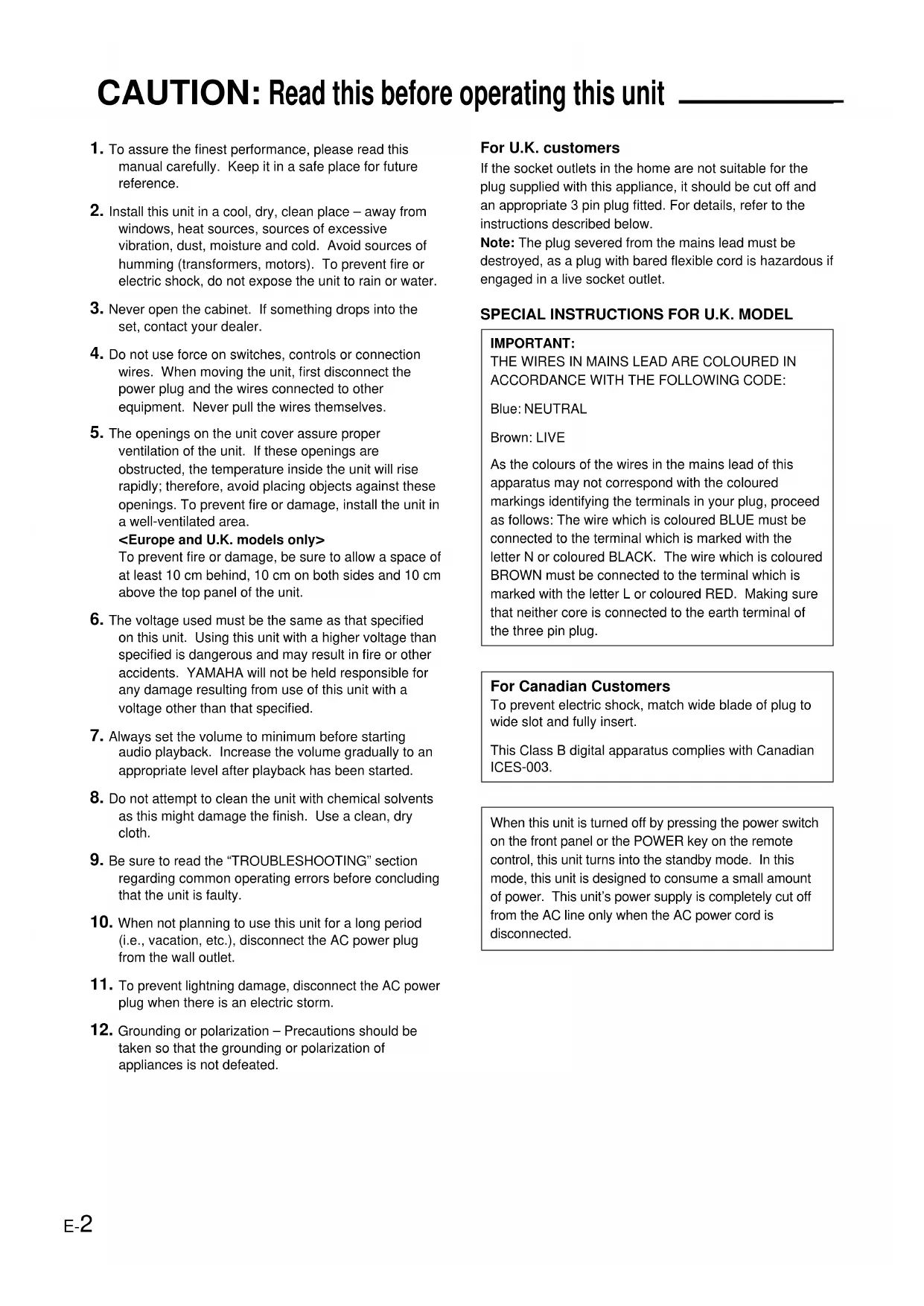 IMPORTANT: THE WIRES IN MAINS LEAD ARE COLOURED IN ACCORDANCE WITH THE FOLLOWING CODE: Blue: NEUTRAL Brown: LIVE As the colours of the wires in the mains lead of this apparatus may not correspond with the coloured markings identifying the terminals in your plug, proceed as follows: The wire which is coloured BLUE must be connected to the terminal which is marked with the letter N or coloured BLACK. The wire which is coloured BROWN must be connected to the terminal which is marked with the letter L or coloured RED. Making sure that neither core is connected to the earth terminal of the three pin plug. For Canadian Customers To prevent electric shock, match wide blade of plug to wide slot and fully insert. This Class B digital apparatus complies with Canadian ICES-003. When this unit is turned off by pressing the power switch on the front panel or the POWER key on the remote control, this unit turns into the standby mode. In this mode, this unit is designed to consume a small amount of power. This unit’s power supply is completely cut off from the AC line only when the AC power cord is disconnected. CAUTION: Read this before operating this unitE-3 English