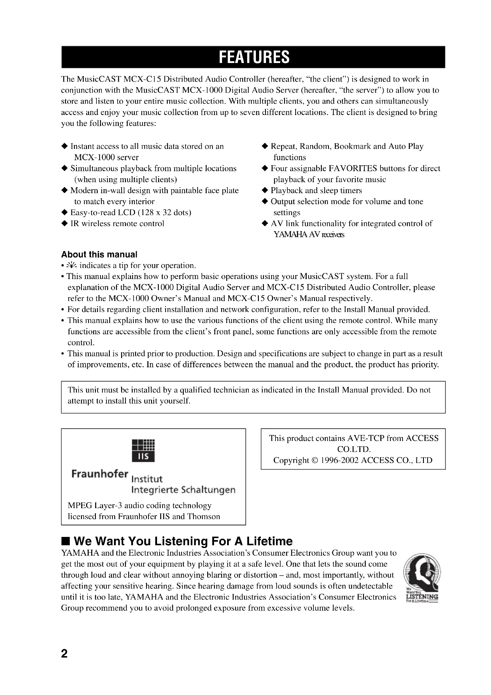 - This manual is printed prior to production. Design and specifications are subject to change in part as a result of improvements, etc. In case of differences between the manual and the product, the product has priority. ■ We Want You Listening For A Lifetime YAMAHA and the Electronic Industries Association’s Consumer Electronics Group want you to get the most out of your equipment by playing it at a safe level. One that lets the sound come through loud and clear without annoying blaring or distortion – and, most importantly, without affecting your sensitive hearing. Since hearing damage from loud sounds is often undetectable until it is too late, YAMAHA and the Electronic Industries Association’s Consumer Electronics Group recommend you to avoid prolonged exposure from excessive volume levels. FEATURES This unit must be installed by a qualified technician as indicated in the Install Manual provided. Do not attempt to install this unit yourself. MPEG Layer-3 audio coding technology licensed from Fraunhofer IIS and Thomson This product contains AVE-TCP from ACCESS CO.LTD. Copyright © 1996-2002 ACCESS CO., LTD3 English INTRODUCTION With a variety of network configuration methods possible using a Local Area Network (LAN), the MusicCAST system allows everyone in the family to store their music collection in one central location for playback from other locations around your home. Once music data is stored, you can have fun creating playlists, bookmark songs, and even register your favorite music for instant access at the press of a button. The advanced MusicCAST system is comprised of a server and its connected clients, and the MCX-CA15 optional amplifier can be connected to provide power to speakers and external components.