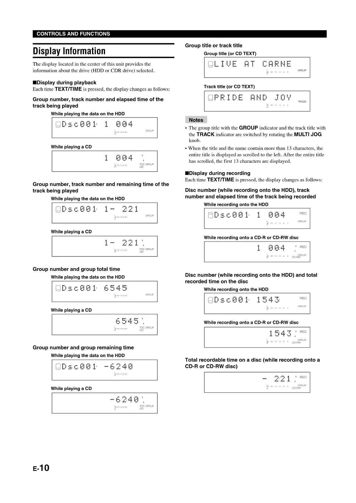 Display Information The display located in the center of this unit provides the information about the drive (HDD or CDR drive) selected. ■ Display during playback Each time TEXT/TIME is pressed, the display changes as follows: Group number, track number and elapsed time of the track being played While playing the data on the HDD While playing a CD Group number, track number and remaining time of the track being played While playing the data on the HDD While playing a CD Group number and group total time While playing the data on the HDD While playing a CD Group number and group remaining time While playing the data on the HDD While playing a CD GROUP