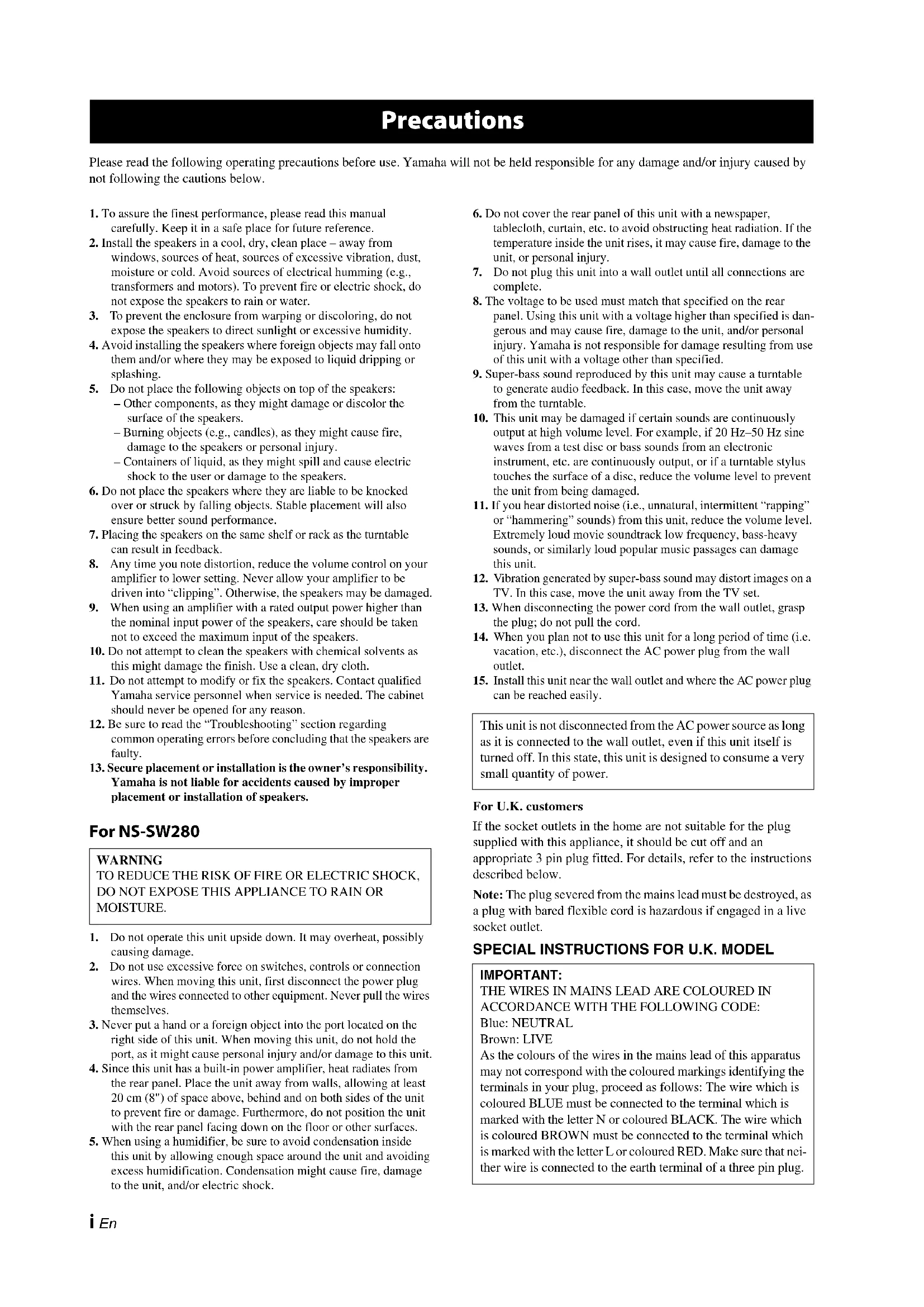 English Français Deutsch Svenska Italiano Español Nederlandsi En Please read the following operating precautions before use. Yamaha will not be held responsible for any damage and/or injury caused by not following the cautions below. 1. To assure the finest performance, please read this manual carefully. Keep it in a safe place for future reference.2. Install the speakers in a cool, dry, clean place – away from windows, sources of heat, sources of excessive vibration, dust, moisture or cold. Avoid sources of electrical humming (e.g., transformers and motors). To prevent fire or electric shock, do not expose the speakers to rain or water.