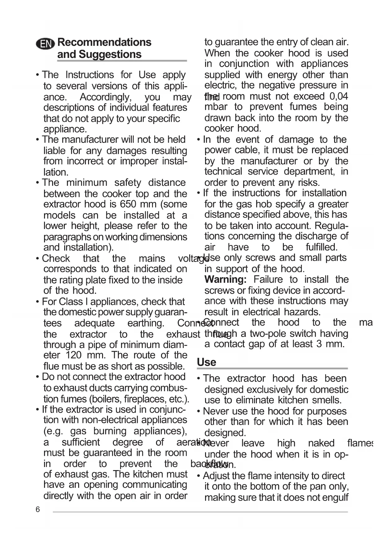 - If the extractor is used in conjunc- tion with non-electrical appliances (e.g. gas burning appliances), a sufcient degree of aeration must be guaranteed in the room in order to prevent the backow of exhaust gas. The kitchen must have an opening communicating directly with the open air in order to guarantee the entry of clean air. When the cooker hood is used in conjunction with appliances supplied with energy other than electric, the negative pressure in the room must not exceed 0,04 mbar to prevent fumes being drawn back into the room by the cooker hood.