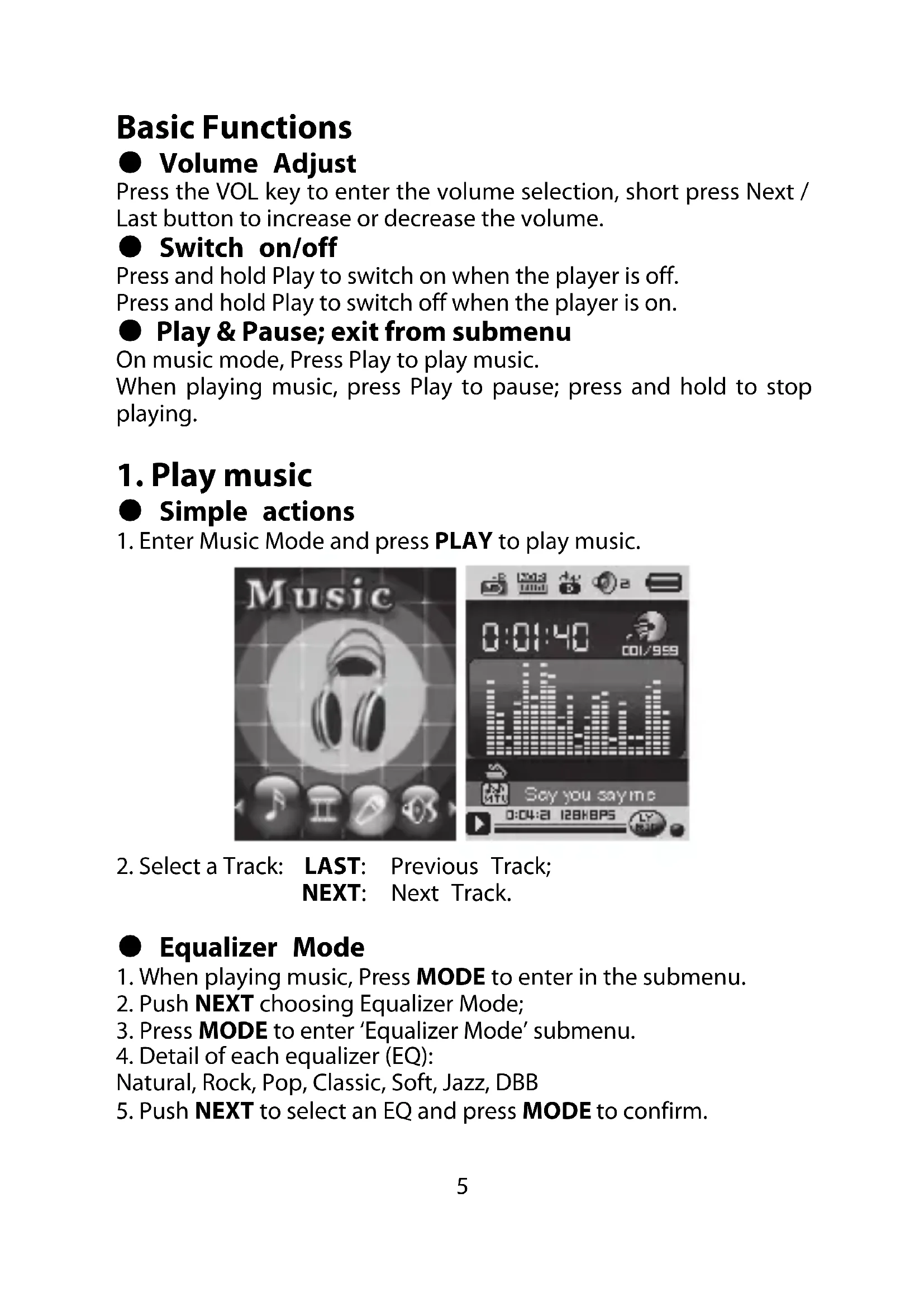 Basic Functions ● Volume Adjust Press the VOL key to enter the volume selection, short press Next / Last button to increase or decrease the volume. ● Switch on/off Press and hold Play to switch on when the player is off. Press and hold Play to switch off when the player is on. ● Play & Pause; exit from submenu On music mode, Press Play to play music. When playing music, press Play to pause; press and hold to stop playing.