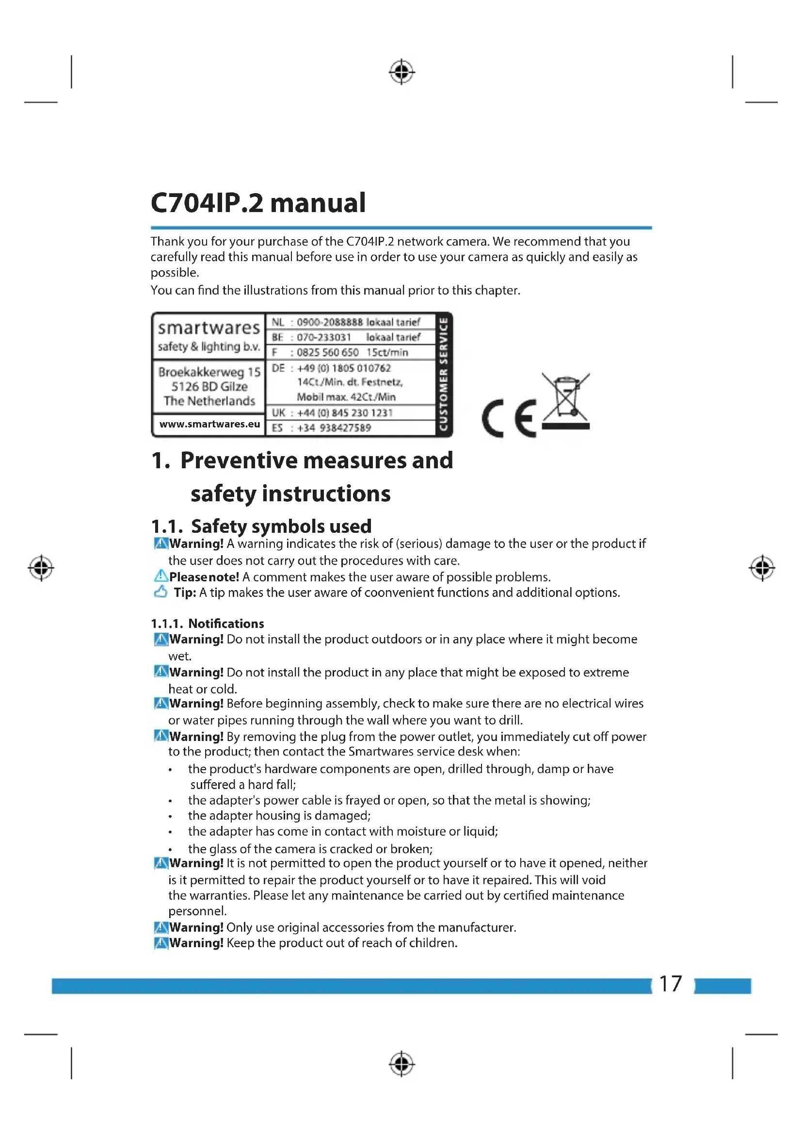 C704IP.2 manual Thank you for your purchase of the C704IP.2 network camera. We recommend that you carefully read this manual before use in order to use your camera as quickly and easily as possible. You can nd the illustrations from this manual prior to this chapter. www.smartwares.eu