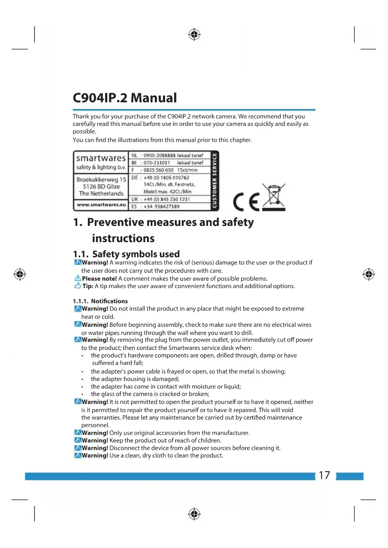 C904IP.2 Manual Thank you for your purchase of the C904IP.2 network camera. We recommend that you carefully read this manual before use in order to use your camera as quickly and easily as possible. You can nd the illustrations from this manual prior to this chapter. www.smartwares.eu