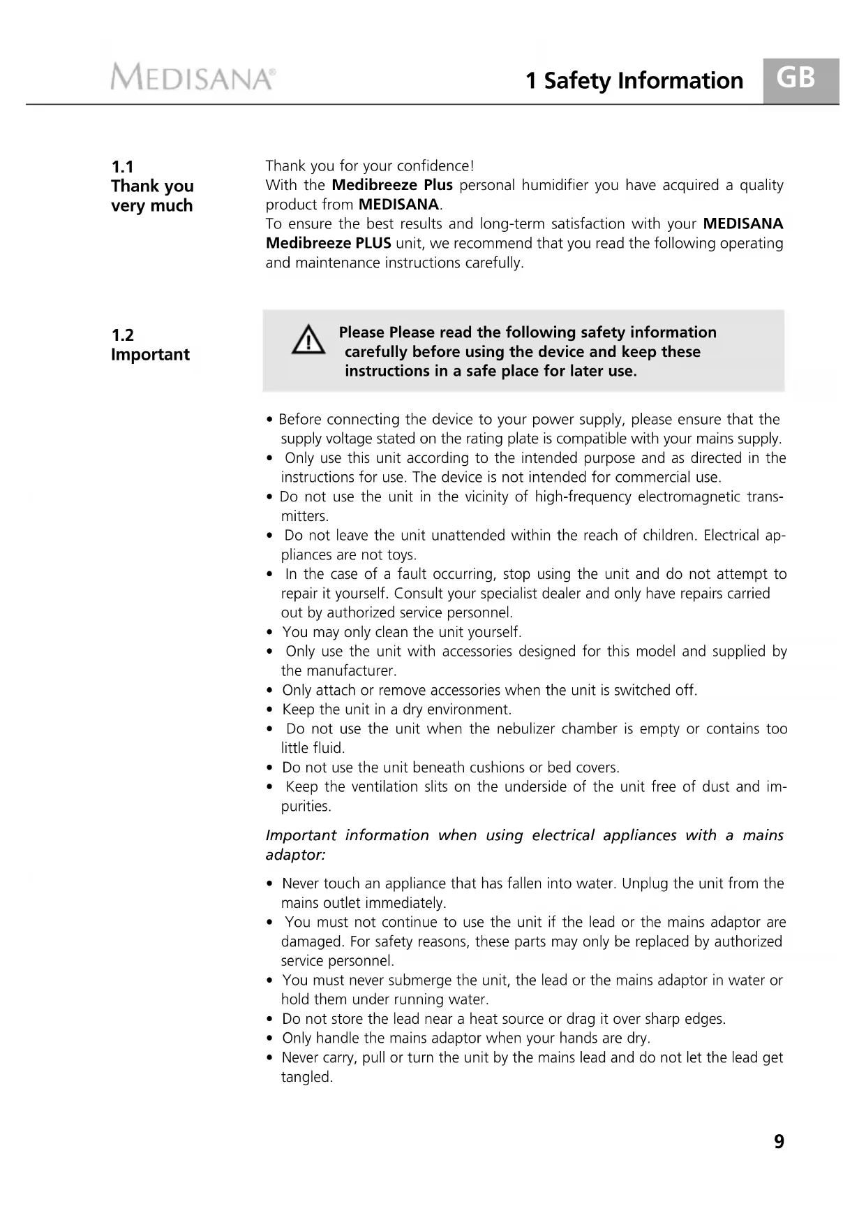 Important Thank you for your confidence! With the Medibreeze Plus personal humidifier you have acquired a quality product from MEDISANA. To ensure the best results and long-term satisfaction with your MEDISANA Medibreeze PLUS unit, we recommend that you read the following operating and maintenance instructions carefully. Please Please read the following safety information carefully before using the device and keep these instructions in a safe place for later use.