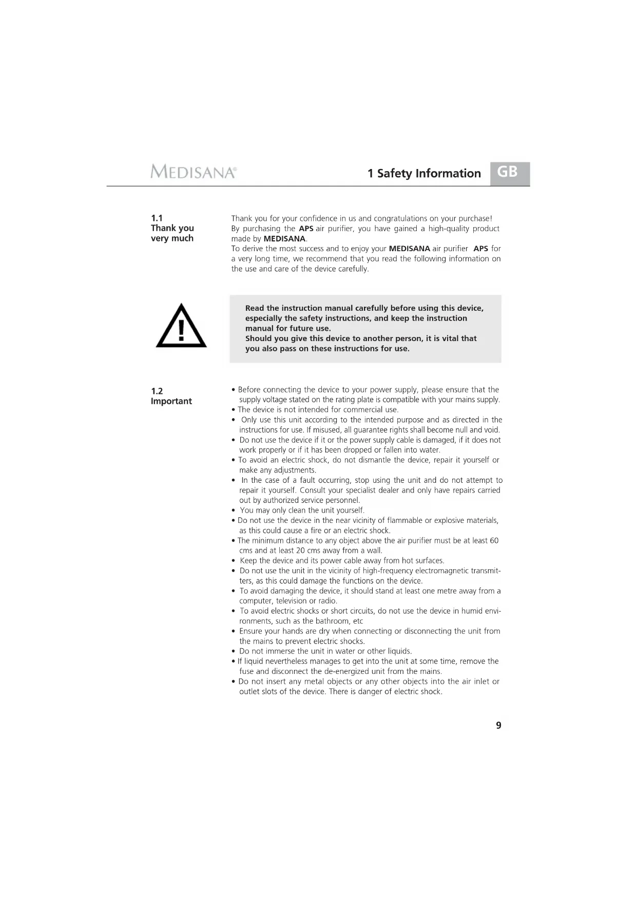 Thank you very much Thank you for your confidence in us and congratulations on your purchase! By purchasing the APS air purifier, you have gained a high-quality product made by MEDISANA. To derive the most success and to enjoy your MEDISANA air purifier APS for a very long time, we recommend that you read the following information on the use and care of the device carefully. Read the instruction manual carefully before using this device, especially the safety instructions, and keep the instruction manual for future use. Should you give this device to another person, it is vital that you also pass on these instructions for use.