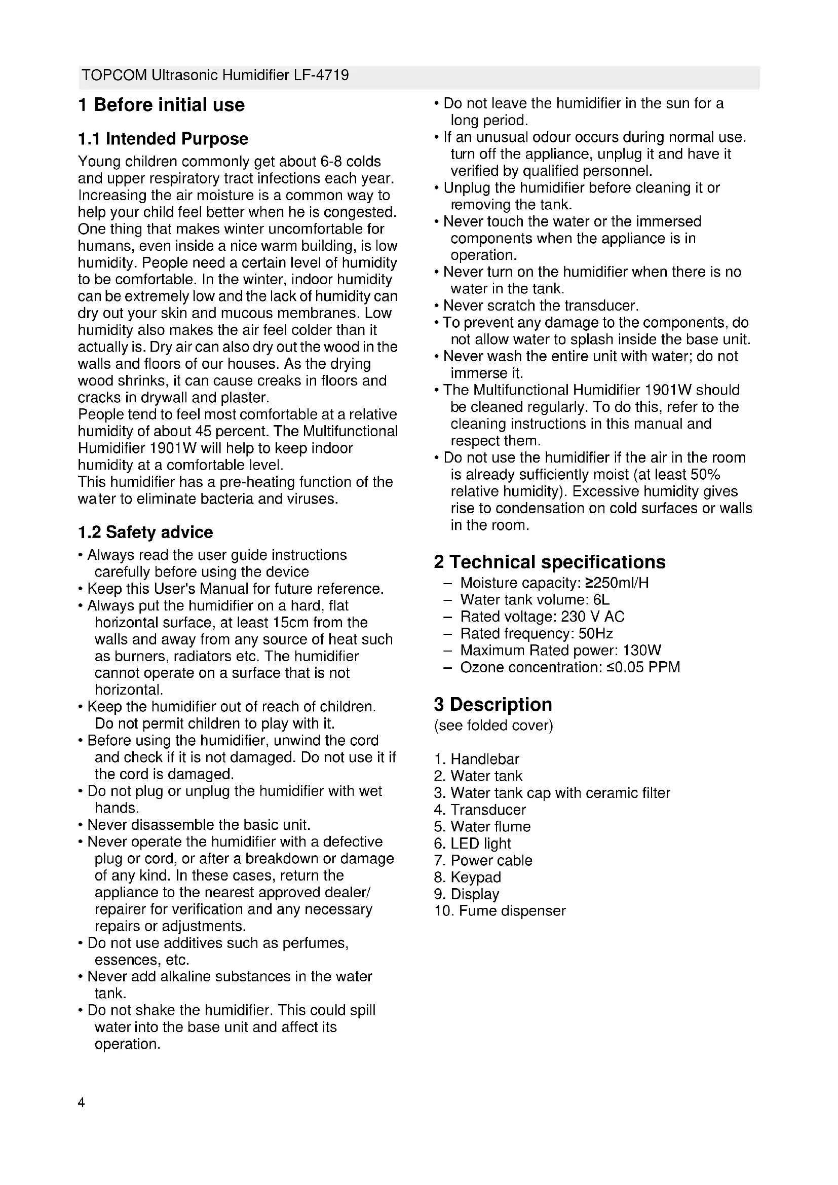 - Do not use the humidifier if the air in the room is alr eady sufficiently moist (at least 50% relative humidity). Excessive humidity gives rise to condensation on cold surfaces or walls in the room. 2 Technical specifications – Moisture capacity: ≥250ml/H – Water tank volume: 6L – Rated voltage: 230 V AC – Rated frequency: 50Hz – Maximum Rated power: 130W – Ozone concentration: ≤0.05 PPM 3 Description (see folded cover)
