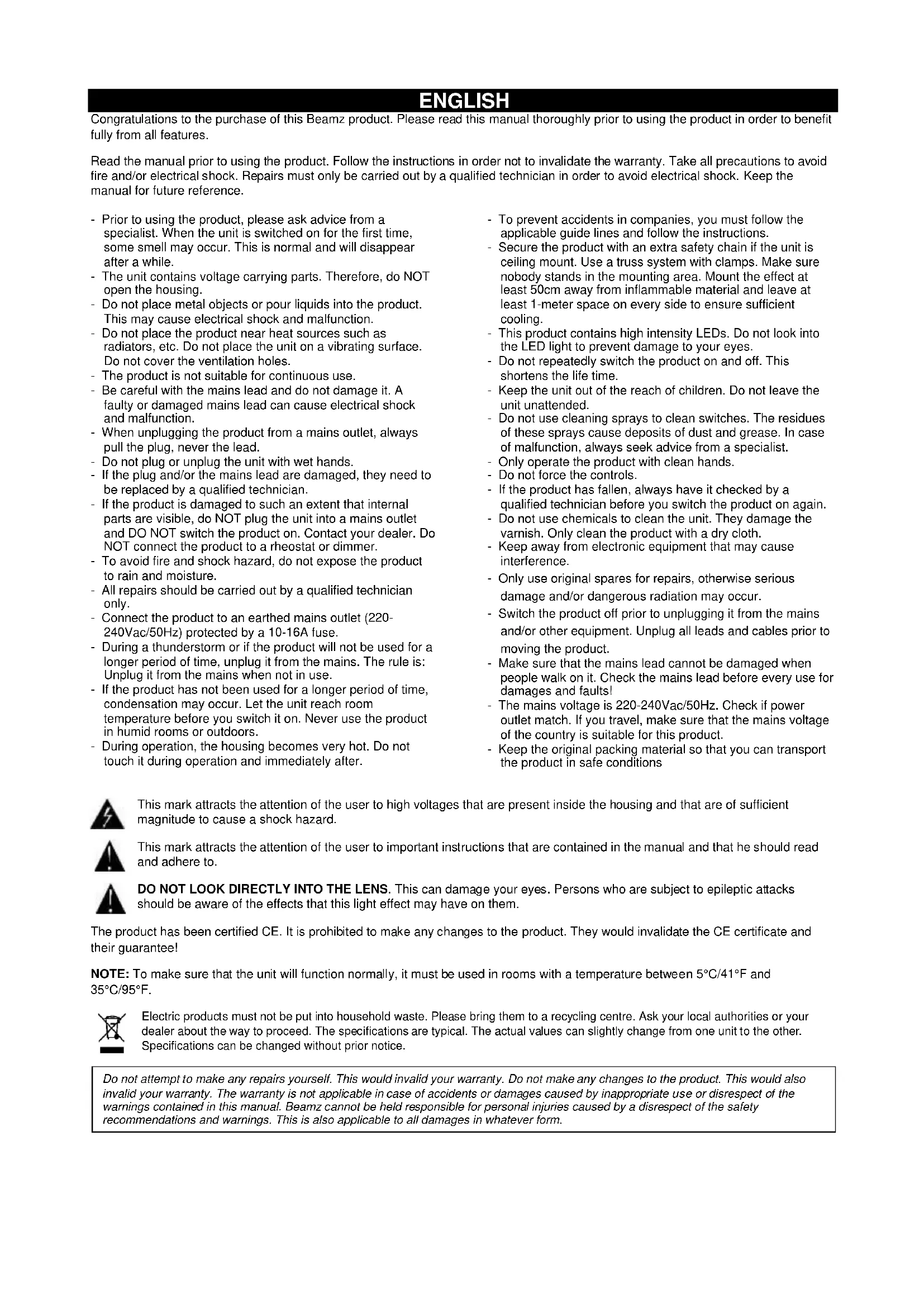 V1.1ENGLISH Congratulations to the purchase of this Beamz product. Please read this manual thoroughly prior to using the product in order to benefit fully from all features. Read the manual prior to using the product. Follow the instructions in order not to invalidate the warranty. Take all precautions to avoid fire and/or electrical shock. Repairs must only be carried out by a qualified technician in order to avoid electrical shock. Keep the manual for future reference. - Prior to using the product, please ask advice from a specialist. When the unit is switched on for the first time, some smell may occur. This is normal and will disappear after a while. - The unit contains voltage carrying parts. Therefore, do NOT open the housing. - Do not place metal objects or pour liquids into the product. This may cause electrical shock and malfunction. - Do not place the product near heat sources such as radiators, etc. Do not place the unit on a vibrating surface. Do not cover the ventilation holes. - The product is not suitable for continuous use. - Be careful with the mains lead and do not damage it. A faulty or damaged mains lead can cause electrical shock and malfunction. - When unplugging the product from a mains outlet, always pull the plug, never the lead. - Do not plug or unplug the unit with wet hands. - If the plug and/or the mains lead are damaged, they need to be replaced by a qualified technician. - If the product is damaged to such an extent that internal parts are visible, do NOT plug the unit into a mains outlet and DO NOT switch the product on. Contact your dealer. Do NOT connect the product to a rheostat or dimmer. - To avoid fire and shock hazard, do not expose the product to rain and moisture. - All repairs should be carried out by a qualified technician only. - Connect the product to an earthed mains outlet (220- 240Vac/50Hz) protected by a 10-16A fuse. - During a thunderstorm or if the product will not be used for a longer period of time, unplug it from the mains. The rule is: Unplug it from the mains when not in use. - If the product has not been used for a longer period of time, condensation may occur. Let the unit reach room temperature before you switch it on. Never use the product in humid rooms or outdoors. - During operation, the housing becomes very hot. Do not touch it during operation and immediately after. - To prevent accidents in companies, you must follow the applicable guide lines and follow the instructions. - Secure the product with an extra safety chain if the unit is ceiling mount. Use a truss system with clamps. Make sure nobody stands in the mounting area. Mount the effect at least 50cm away from inflammable material and leave at least 1-meter space on every side to ensure sufficient cooling. - This product contains high intensity LEDs. Do not look into the LED light to prevent damage to your eyes. - Do not repeatedly switch the product on and off. This shortens the life time. - Keep the unit out of the reach of children. Do not leave the unit unattended. - Do not use cleaning sprays to clean switches. The residues of these sprays cause deposits of dust and grease. In case of malfunction, always seek advice from a specialist. - Only operate the product with clean hands. - Do not force the controls. - If the product has fallen, always have it checked by a qualified technician before you switch the product on again. - Do not use chemicals to clean the unit. They damage the varnish. Only clean the product with a dry cloth. - Keep away from electronic equipment that may cause interference. - Only use original spares for repairs, otherwise serious damage and/or dangerous radiation may occur. - Switch the product off prior to unplugging it from the mains and/or other equipment. Unplug all leads and cables prior to moving the product. - Make sure that the mains lead cannot be damaged when people walk on it. Check the mains lead before every use for damages and faults! - The mains voltage is 220-240Vac/50Hz. Check if power outlet match. If you travel, make sure that the mains voltage of the country is suitable for this product. - Keep the original packing material so that you can transport the product in safe conditions This mark attracts the attention of the user to high voltages that are present inside the housing and that are of sufficient magnitude to cause a shock hazard. This mark attracts the attention of the user to important instructions that are contained in the manual and that he should read and adhere to. DO NOT LOOK DIRECTLY INTO THE LENS. This can damage your eyes. Persons who are subject to epileptic attacks should be aware of the effects that this light effect may have on them. The product has been certified CE. It is prohibited to make any changes to the product. They would invalidate the CE certificate and their guarantee! NOTE: To make sure that the unit will function normally, it must be used in rooms with a temperature between 5°C/41°F and 35°C/95°F. Electric products must not be put into household waste. Please bring them to a recycling centre. Ask your local authorities or your dealer about the way to proceed. The specifications are typical. The actual values can slightly change from one unit to the other. Specifications can be changed without prior notice. Do not attempt to make any repairs yourself. This would invalid your warranty. Do not make any changes to the product. This would also invalid your warranty. The warranty is not applicable in case of accidents or damages caused by inappropriate use or disrespect of the warnings contained in this manual. Beamz cannot be held responsible for personal injuries caused by a disrespect of the safety recommendations and warnings. This is also applicable to all damages in whatever form.LASERSAFETY