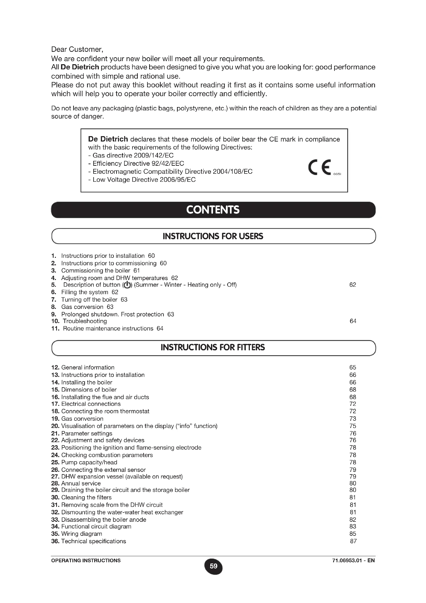De Dietrich declares that these models of boiler bear the CE mark in compliance with the basic requirements of the following Directives: - Gas directive 2009/142/EC - Efciency Directive 92/42/EEC - Electromagnetic Compatibility Directive 2004/108/EC - Low Voltage Directive 2006/95/EC60 71.06953.01 - EN OPERATING INSTRUCTIONS This boiler has been designed to heat water to a temperature lower than boiling point at atmospheric pressure. It must be connected to a central heating system and to a domestic hot water supply system according to its performance and power output. Before having the boiler installed by a qualied tter, make sure the following operations are performed: a) Make sure that the boiler is adjusted to use the type of gas delivered by the gas supply. To do this, check the markings on the packaging and the rating plate on the appliance. b) Make sure that the ue terminal draft is appropriate, that the terminal is not obstructed and that no exhaust gases from other appliances are expelled through the same ue duct, unless the latter has been specially designed to collect exhaust gas from more than one appliance, in compliance with current laws and regulations. c) Make sure that, if the boiler is connected to existing ue ducts, these have been thoroughly cleaned as residual products of combustion may detach from the walls during operation and obstruct the ow of fumes. d) To ensure correct operation and maintain the warranty, observe the following precautions:
