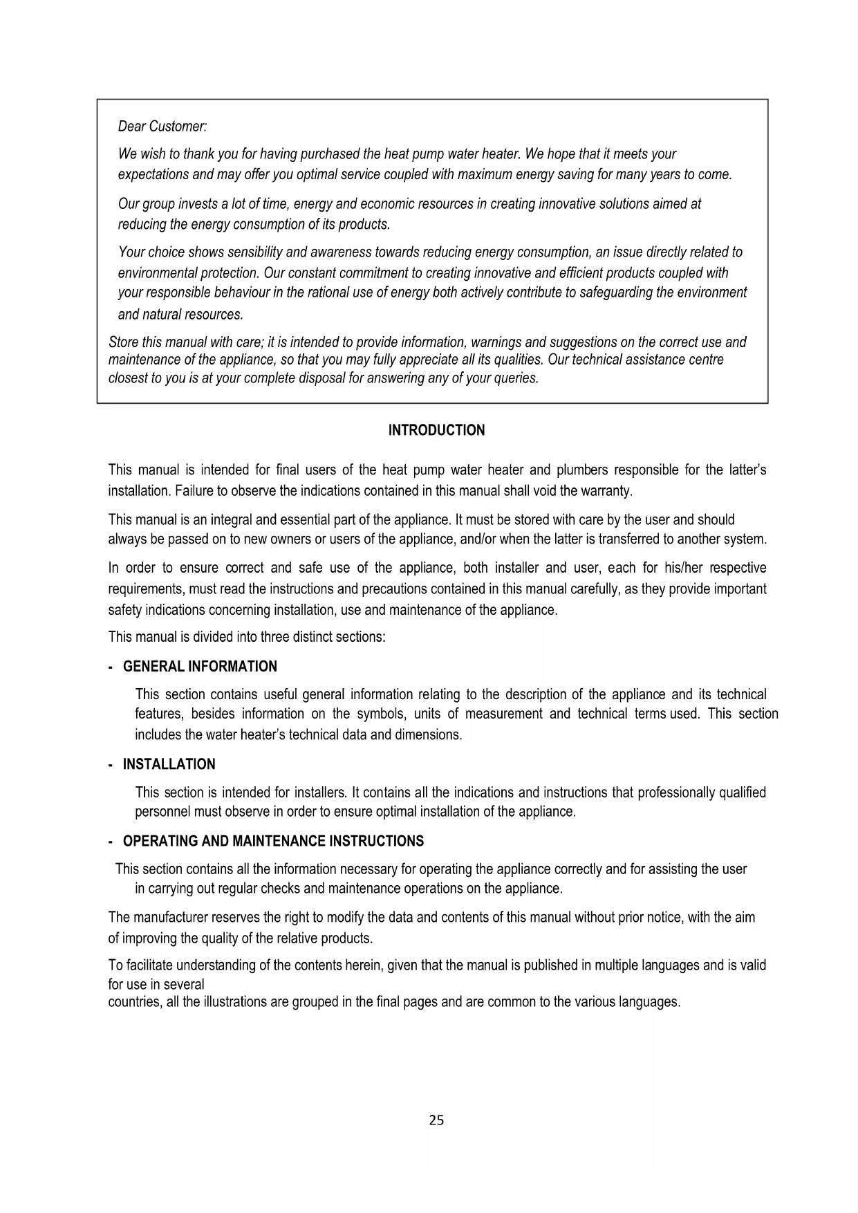 Dear Customer: We wish to thank you for having purchased the heat pump water heater. We hope that it meets your expectations and may offer you optimal service coupled with maximum energy saving for many years to come. Our group invests a lot of time, energy and economic resources in creating innovative solutions aimed at reducing the energy consumption of its products. Your choice shows sensibility and awareness towards reducing energy consumption, an issue directly related to environmental protection. Our constant commitment to creating innovative and efficient products coupled with your responsible behaviour in the rational use of energy both actively contribute to safeguarding the environment and natural resources. Store this manual with care; it is intended to provide information, warnings and suggestions on the correct use and maintenance of the appliance, so that you may fully appreciate all its qualities. Our technical assistance centre closest to you is at your complete disposal for answering any of your queries.
