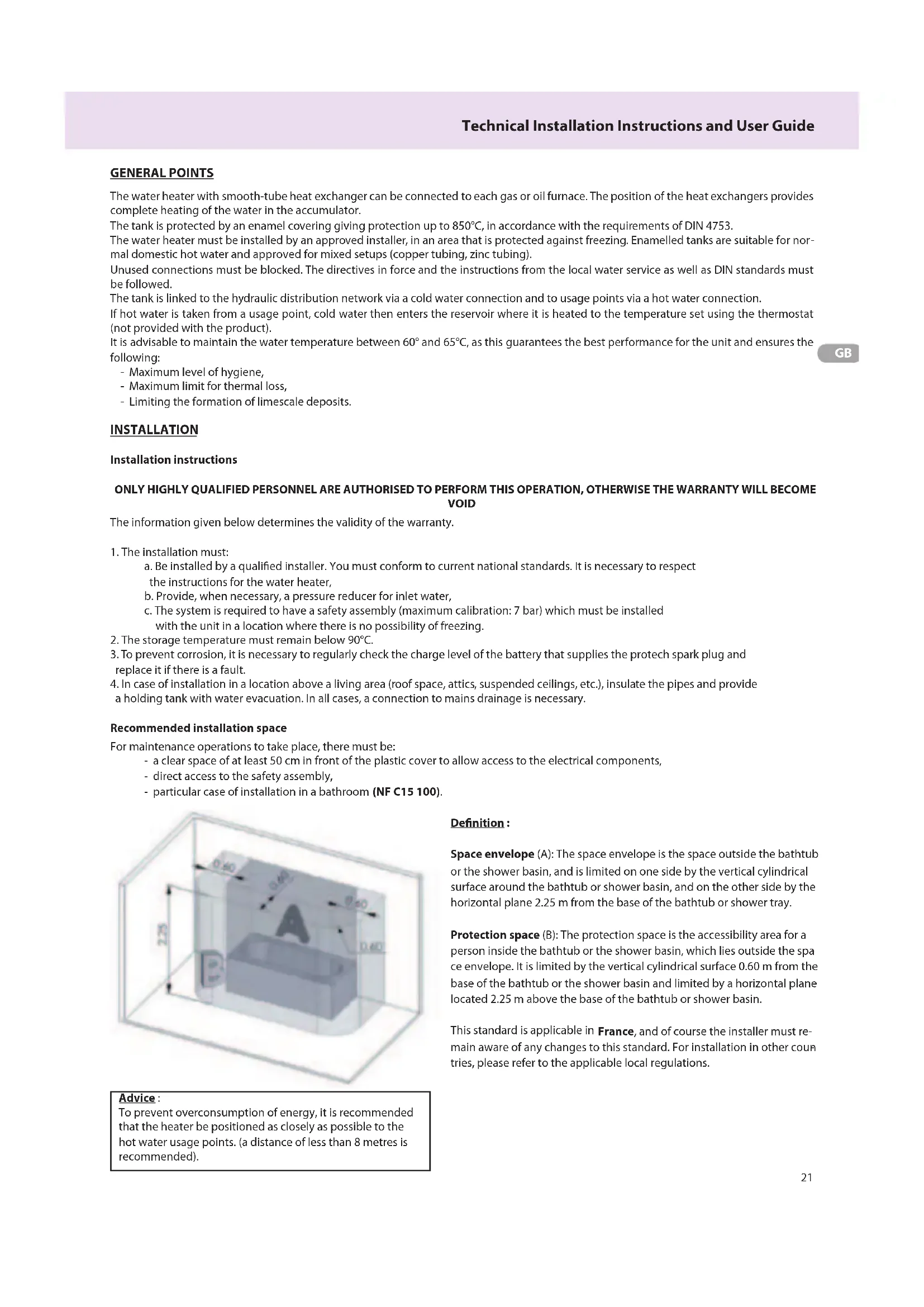 tries, please refer to the applicable local regulations. Advice : To prevent overconsumption of energy, it is recommended that the heater be positioned as closely as possible to the hot water usage points. (a distance of less than 8 metres is recommended).22 Technical Installation Instructions and User Guide