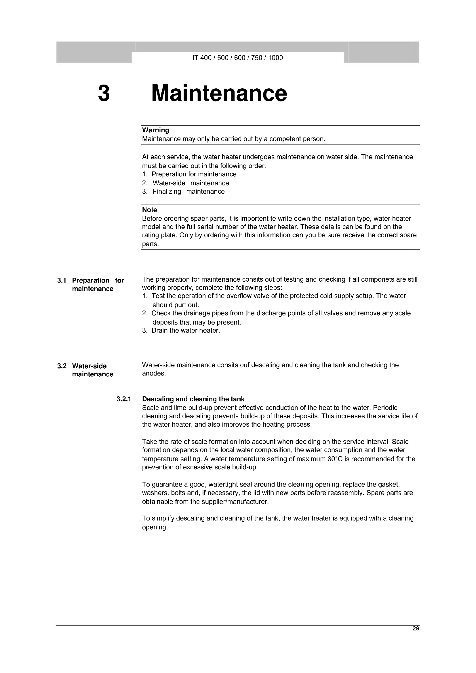 Descaling and cleaning the tank Scale and lime build-up prevent effective conduction of the heat to the water. Periodic cleaning and descaling prevents build-up of these deposits. This increases the service life of the water heater, and also improves the heating process. Take the rate of scale formation into account when deciding on the service interval. Scale formation depends on the local water composition, the water consumption and the water temperature setting. A water temperature setting of maximum 60°C is recommended for the prevention of excessive scale build-up. To guarantee a good, watertight seal around the cleaning opening, replace the gasket, washers, bolts and, if necessary, the lid with new parts before reassembly. Spare parts are obtainable from the supplier/manufacturer. To simplify descaling and cleaning of the tank, the water heater is equipped with a cleaning opening.IT 400 / 500 / 600 / 750 / 1000