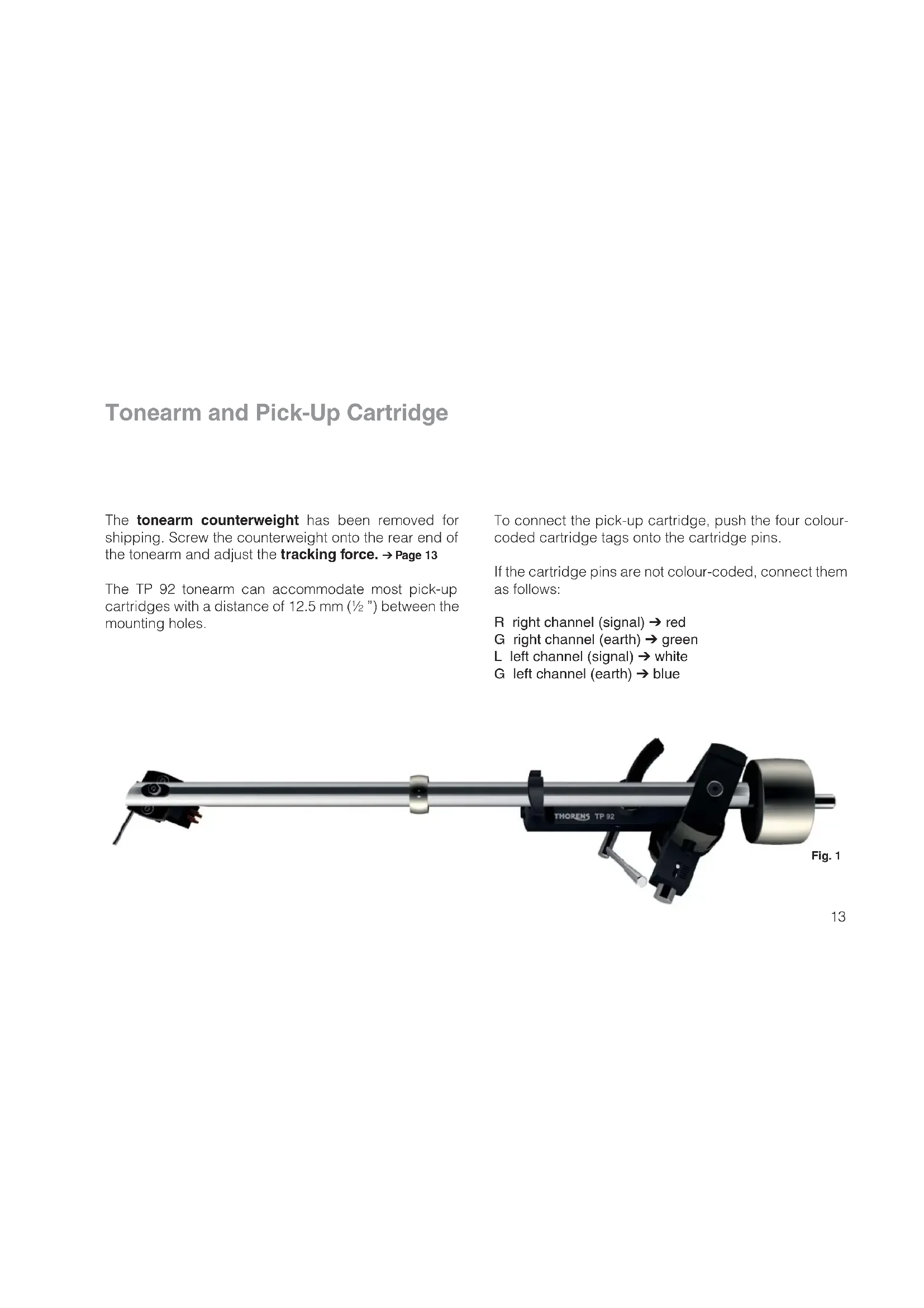 Tonearm and Pick-Up Cartridge Fig. 1 The tonearm counterweight has been removed for shipping. Screw the counterweight onto the rear end of the tonearm and adjust the tracking force. ➔ Page 13 The TP 92 tonearm can accommodate most pick-up cartridges with a distance of 12.5 mm (½ ”) between the mounting holes. To connect the pick-up cartridge, push the four colour- coded cartridge tags onto the cartridge pins. If the cartridge pins are not colour-coded, connect them as follows: R right channel (signal) ➔ red G right channel (earth) ➔ green L left channel (signal) ➔ white G left channel (earth) ➔ blue14 Tracking Force The tracking force can be adjusted by rotating the to- nearm counterweight (➔ Fig. 2). The closer the counter- weight is to the cartridge, the higher the tracking force. The tracking force can be set with the help of the sup- plied stylus balance. Lower the tonearm lift, move the tonearm out over the platter and carefully lower it until the stylus of the pick-up cartridge comes to rest on the stylus balance. The stylus guard must be removed for this procedure. Great care should be taken to avoid damaging the stylus. Note: Refer to the user manual of your pick-up car- tridge to determine the correct tracking force. Fig. 2 Do not move the ring that sits around the middle of the tonearm tube (➔ Fig. 1). It serves as a vibration damper and is effective only at its original position.15 Anti-Skating Force (Bias) The interaction of stylus friction and cartridge-bearing forces produces a force which pulls the tonearm to- wards the centre of the record (referred to as skating force). This force can be offset with the help of anti-skat- ing force, which, in the case of the TP 92, is produced by a magnet incorporated into the tonearm. The anti-skating force is factory-adjusted. If neces- sary, it can be readjusted with the help of an adjust- ment screw. ➔ Fig. 3 Turn the adjustment screw anti-clockwise to increase, and clockwise to decrease the anti-skating force. The white dot above the adjustment screw indicates the set- ting. The amount of anti-skating force required depends on the type of pick-up cartridge used. If you change the cartridge for a different type, use a test record to determine how much anti-skating force is required. Fig. 316 Further Tonearm Adjustments The tonearm headshell allows an overhang adjustment of ± 2,5 mm to be made. To adjust overhang, loosen the screw holding the headshell and move the headshell as required. ➔ Fig. 4 A screw at the rear of the tonearm allows a further over- hang adjustment of ±3 mm as well as an azimuth ad- justment of ±5°. The screw is recessed into the top of the bearing housing and can be loosened with a 2-mm hex key. ➔ Fig. 5 The vertical tracking angle (VTA) can be adjusted by raising or lowering the tonearm. ➔ Page 16 Take care not to over-tighten the screws after making adjustments. Fig. 4 Fig. 517 Further Tonearm Adjustments The vertical tracking angle (VTA) can be adjusted by raising or lowering the entire tonearm. Loosen the lock nut (➔ Fig. 6) on the underside of the turntable; then turn the adjustment ring above the base to raise or lower the tonearm as required. If the VTA is changed, the tonearm lift will need to be to be readjusted. Loosen the locking screw on the to- nearm lift with a 1.5-mm hex key and carefully raise or lower the entire lift. ➔ Fig. 7 The tonearm tube should be parallel to the platter surface. Small adjustments of the VTA or the tonearm lift height can have a large effect. After making any changes, you should therefore always check whether there is enough clearance (at least 1 mm) between the cartridge and the record (when the lift is engaged) and between the tonearm lift pad and the tonearm tube (when the lift is disengaged). Fig. 7 Fig. 618 Technical Speci cations Technical specifi cations subject to change without notice. Made in Germany. Tonearm speci cation Distance tonearm pivot to stylus Effective length Stylus overhang Angular offset Inner null Outer null Effective mass Maximum distortion between null-points Geometry Weight Connestors Mounting hole Antiskating