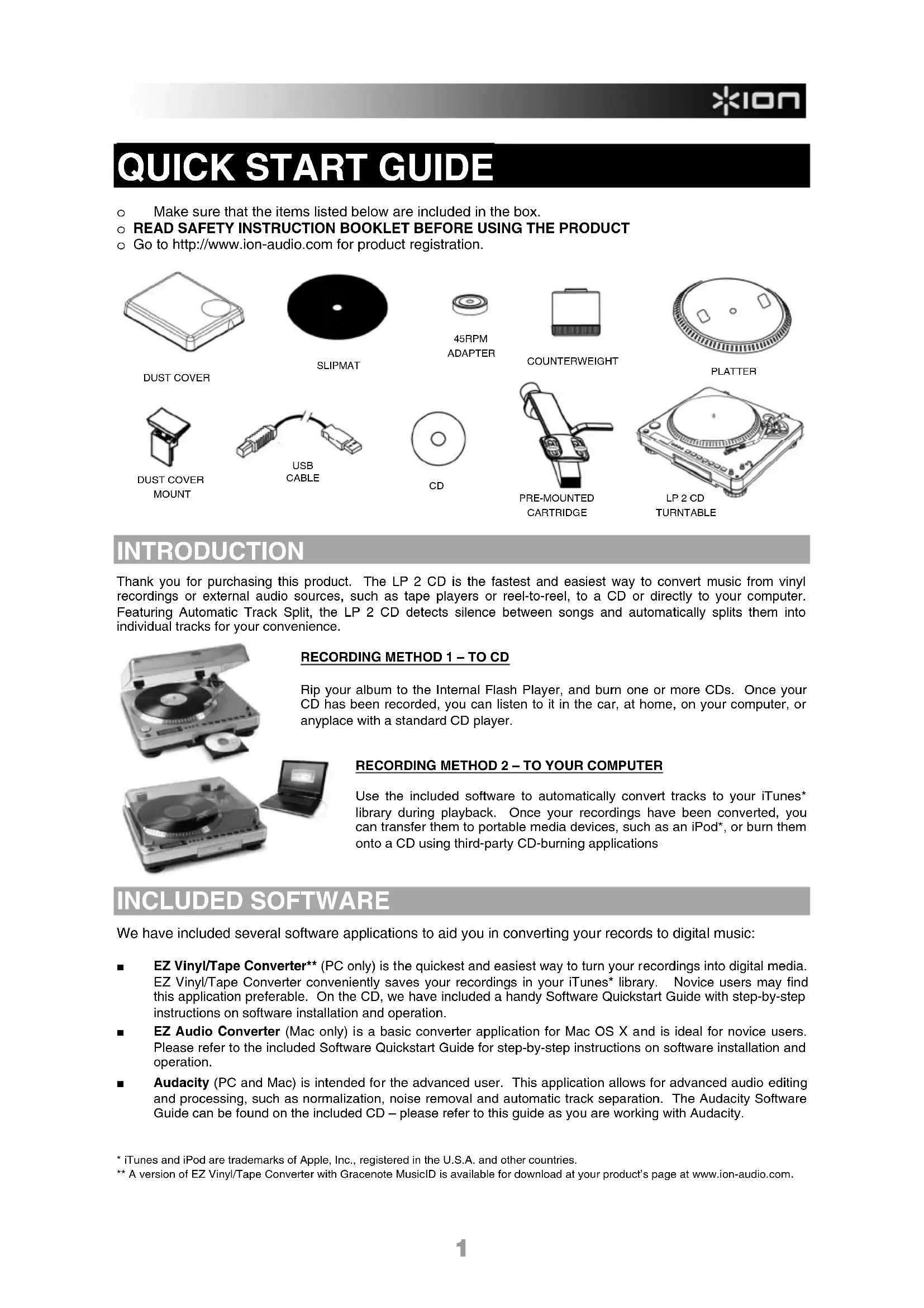 Thank you for purchasing this product. The LP 2 CD is the fastest and easiest way to convert music from vinyl recordings or external audio sources, such as tape players or reel-to-reel, to a CD or directly to your computer. Featuring Automatic Track Split, the LP 2 CD detects silence between songs and automatically splits them into individual tracks for your convenience.