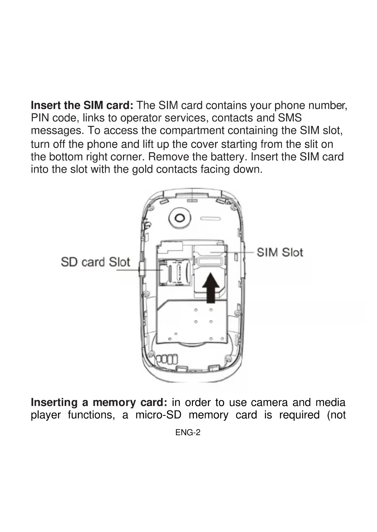 Senior Phone GSP-130 www.facebook.com/denverelectronics User Guide EnglishENG-2 Insert the SIM card: The SIM card contains your phone number, PIN code, links to operator services, contacts and SMS messages. To access the compartment containing the SIM slot, turn off the phone and lift up the cover starting from the slit on the bottom right corner. Remove the battery. Insert the SIM card into the slot with the gold contacts facing down.