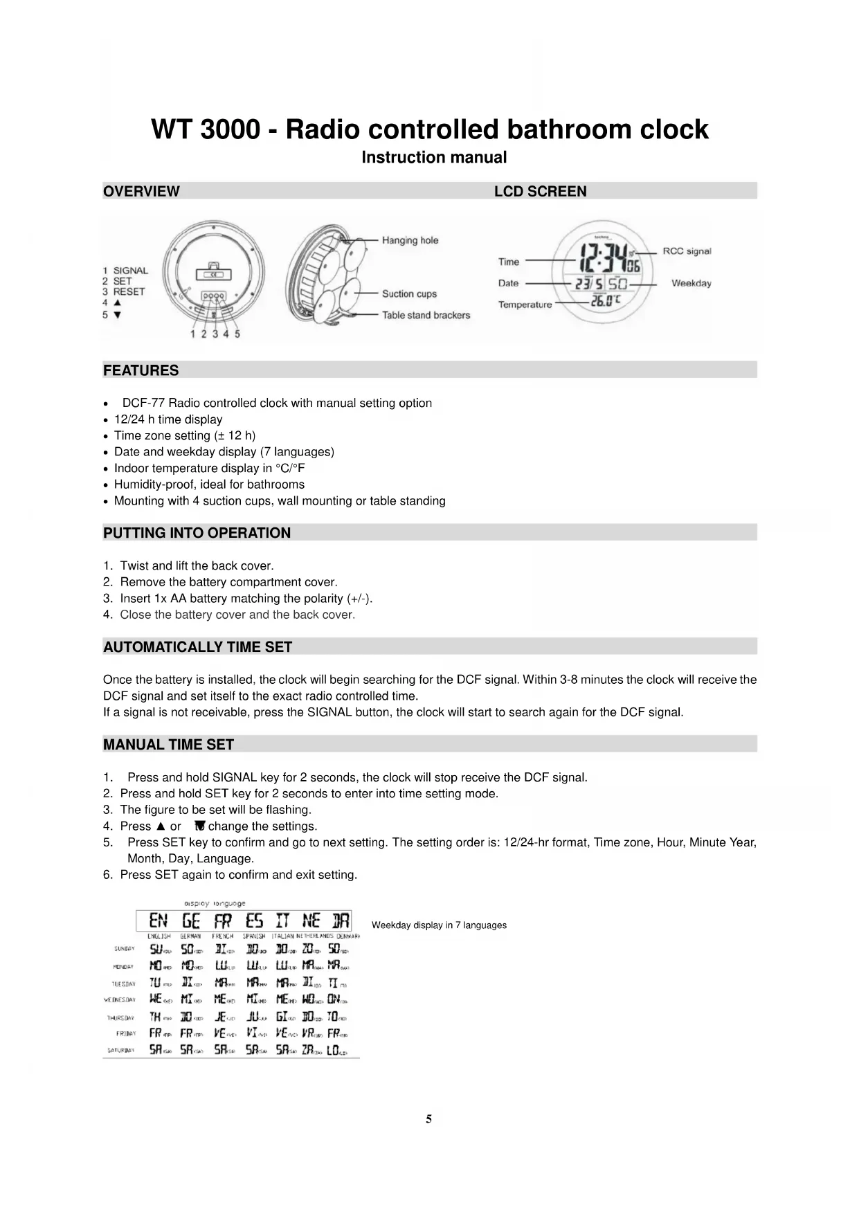 Time Date Temperature 12:34 23/5 50 26.0°C RCC signal WeekdayFEATURES