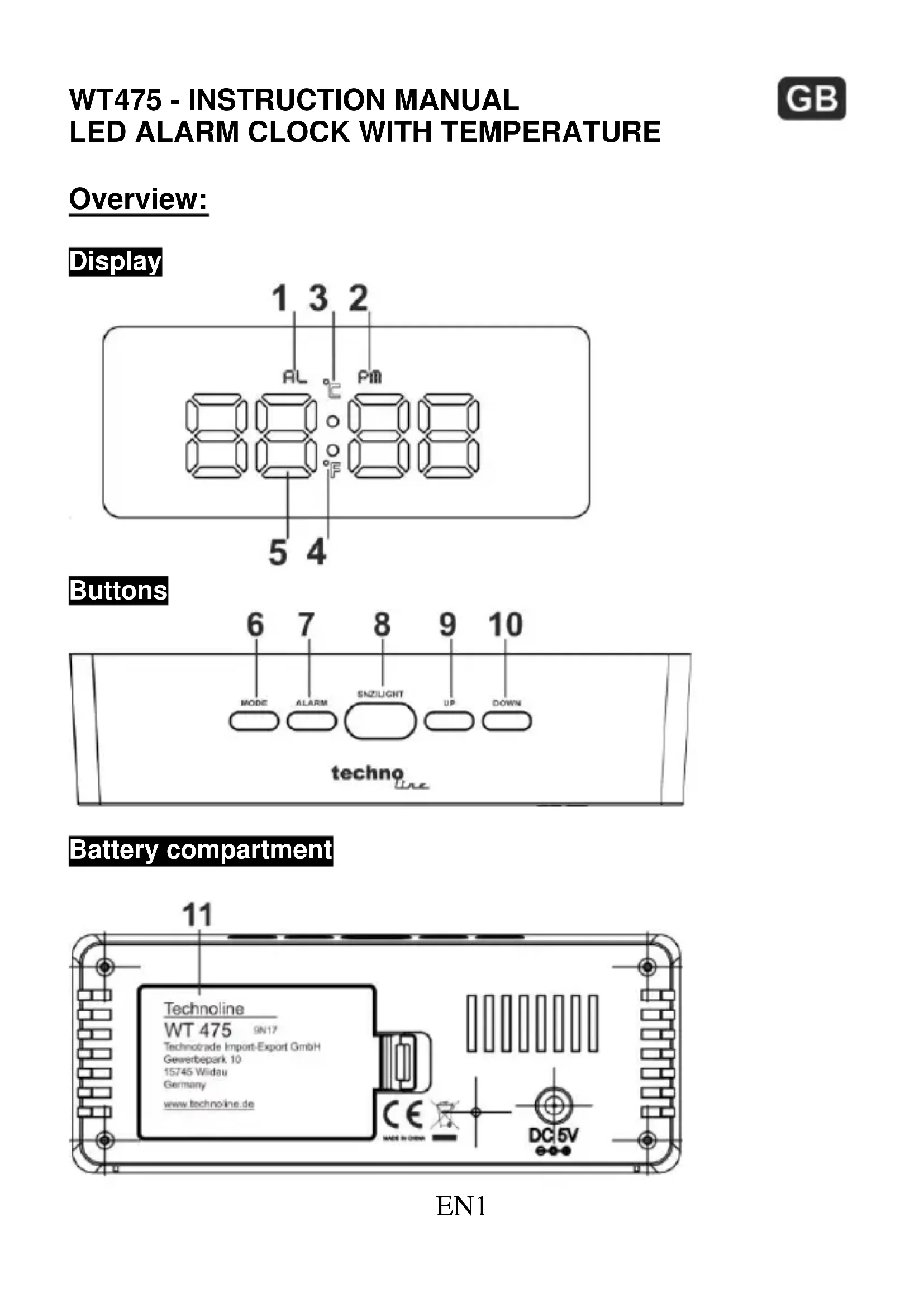 11 Technoline WT 475 9N17 Technotrade Import-Export GmbH Gewerbepark.10 16745 Widau Germany www.technoline.de CE MEOCHINA DC 5VCZ1