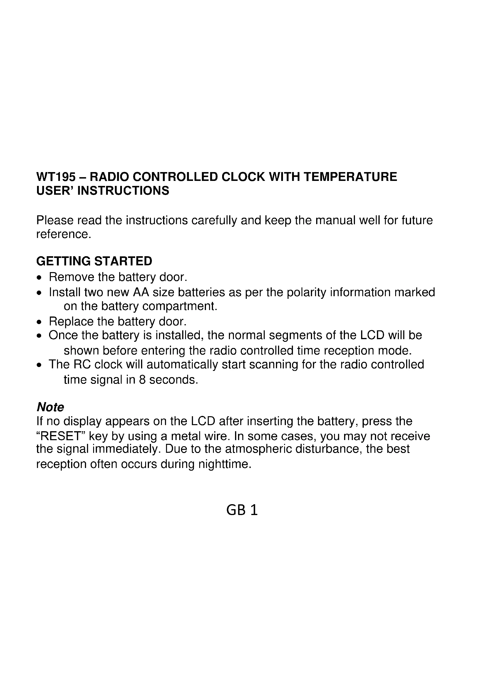 If no display appears on the LCD after inserting the battery, press the "RESET" key by using a metal wire. In some cases, you may not receive the signal immediately. Due to the atmospheric disturbance, the best reception often occurs during nighttime.