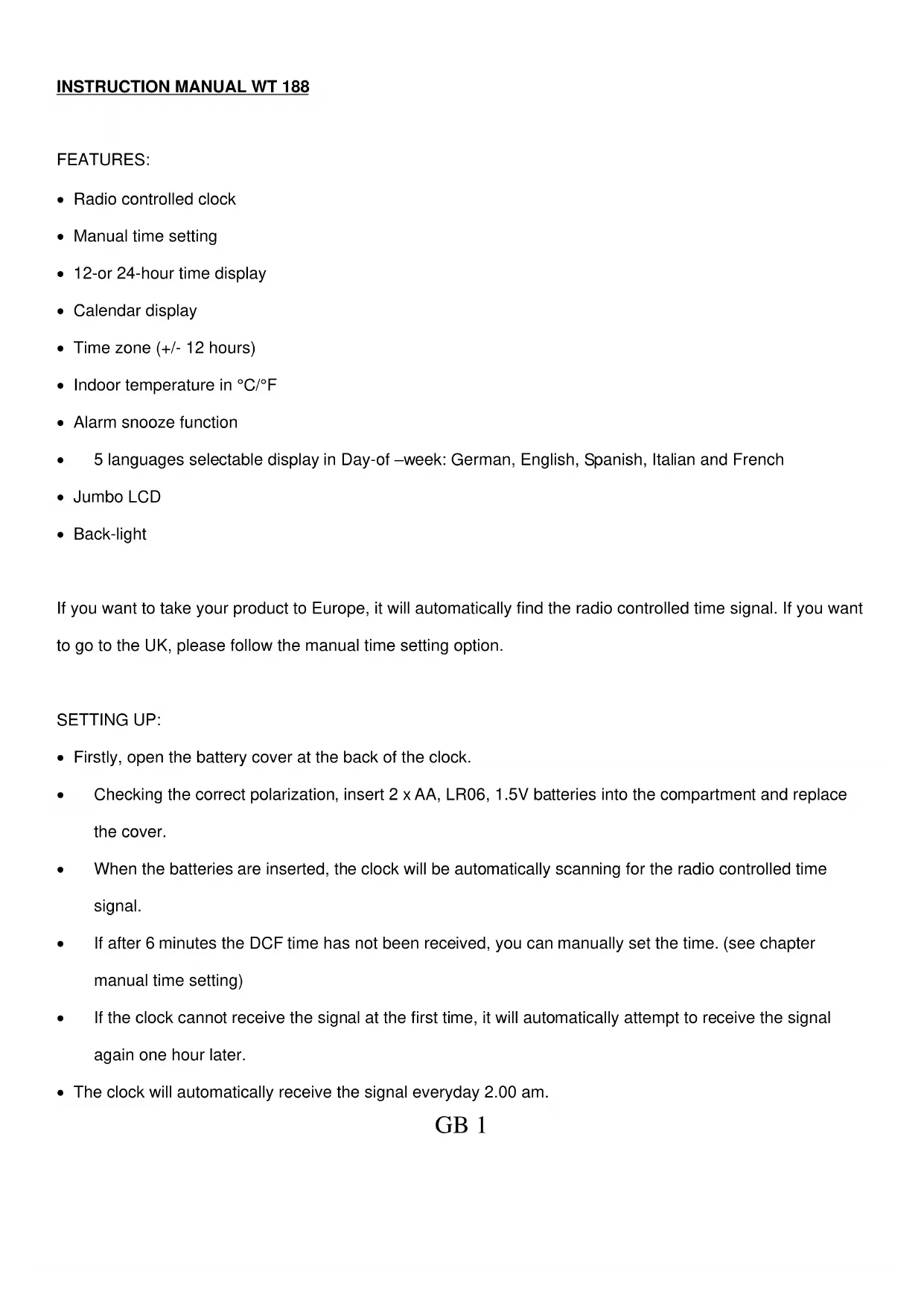 If you want to take your product to Europe, it will automatically find the radio controlled time signal. If you want to go to the UK, please follow the manual time setting option.