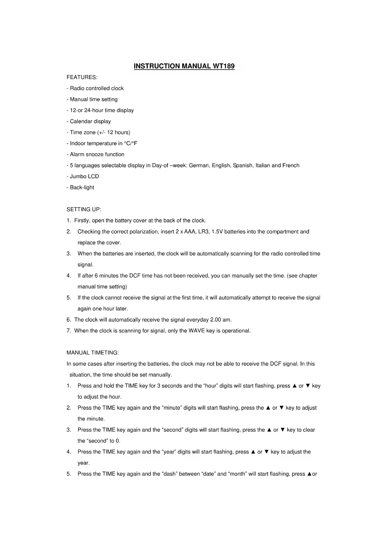 In some cases after inserting the batteries, the clock may not be able to receive the DCF signal. In this situation, the time should be set manually.
