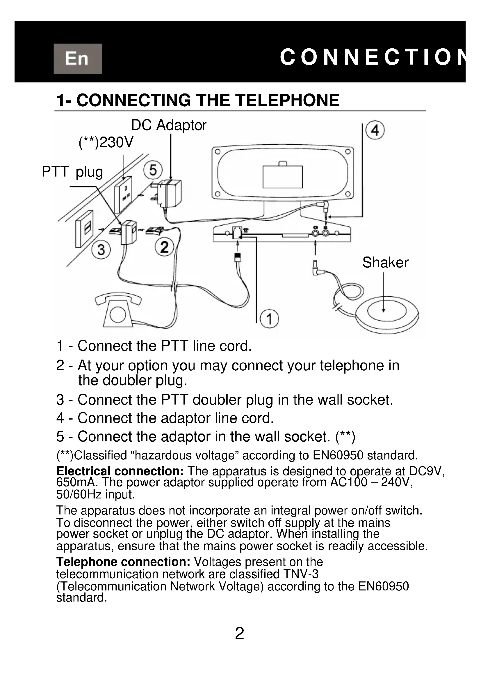 (**)Classified “hazardous voltage” according to EN60950 standard. Electrical connection: The apparatus is designed to operate at DC9V, 650mA. The power adaptor supplied operate from AC100 – 240V, 50/60Hz input. The apparatus does not incorporate an integral power on/off switch. To disconnect the power, either switch off supply at the mains power socket or unplug the DC adaptor. When installing the apparatus, ensure that the mains power socket is readily accessible. Telephone connection: Voltages present on the telecommunication network are classified TNV-3 (Telecommunication Network Voltage) according to the EN60950 standard. CONNECTION (**)230V PTT plug DC Adapto
