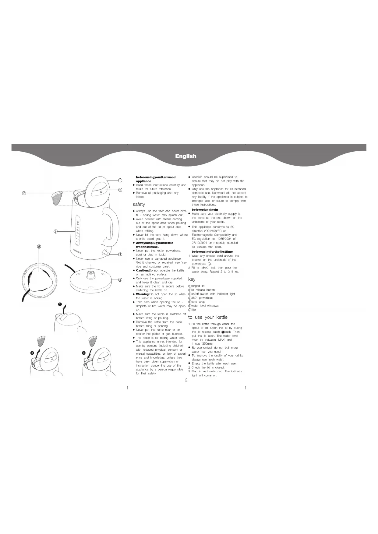 This appliance conforms to EC directive 2004/108/EC on Electromagnetic Compatibility and EC regulation no. 1935/2004 of 27/10/2004 on materials intended for contact with food. before using for the first time 1 Wrap any excess cord around the bracket on the underside of the powerbase . 2 Fill to ‘MAX’, boil, then pour the water away. Repeat 2 to 3 times. key hinged lid lid release button on/off switch with indicator light 360° powerbase cord wrap water level windows filter to use your kettle 1 Fill the kettle through either the spout or lid. Open the lid by pulling the lid release catch back. Then pull the lid back. The water level must be between ‘MAX’ and 1 cup (250mls).