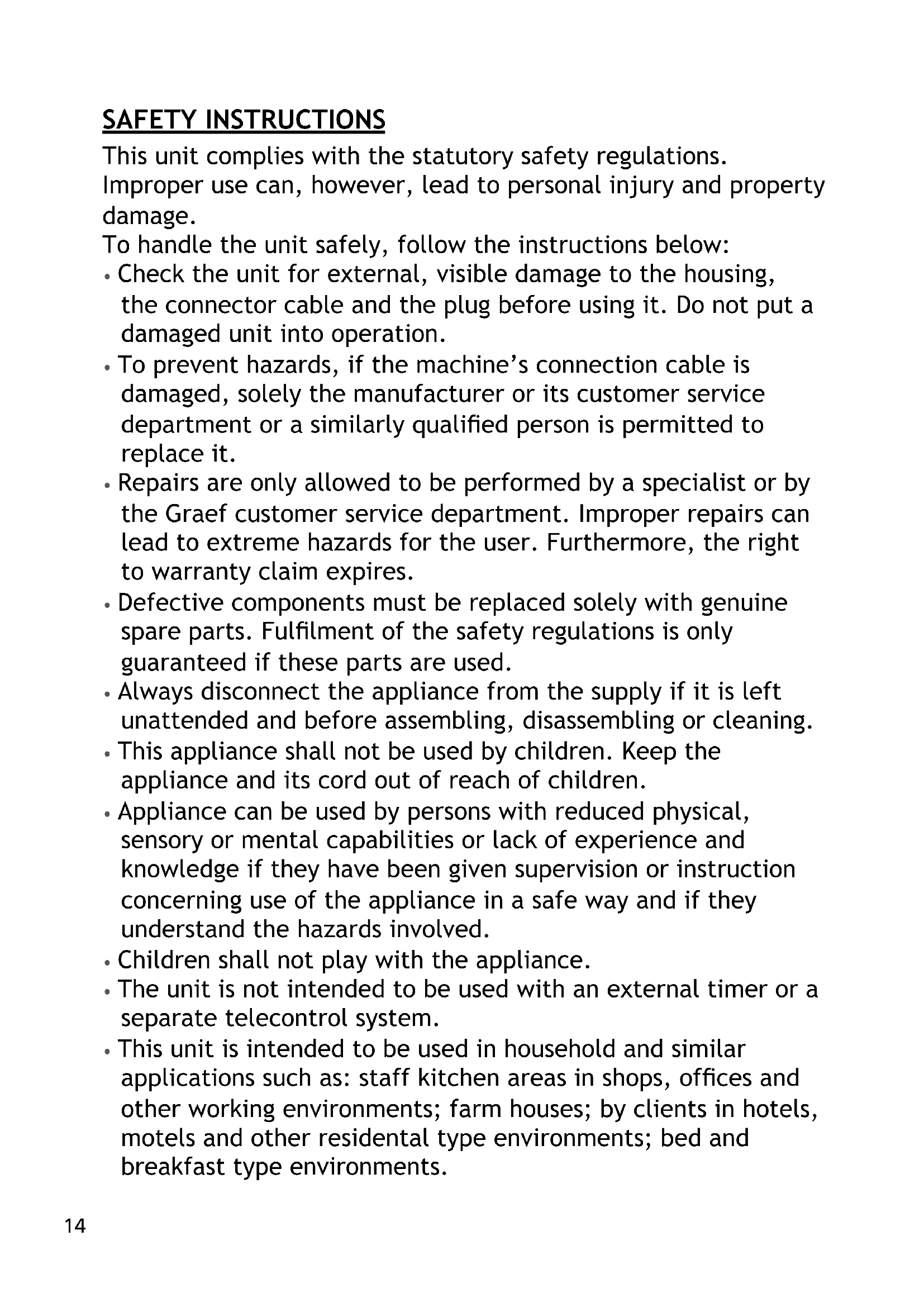 - Repairs are only allowed to be performed by a specialist or by the Graef customer service department. Improper repairs can lead to extreme hazards for the user. Furthermore, the right to warranty claim expires.