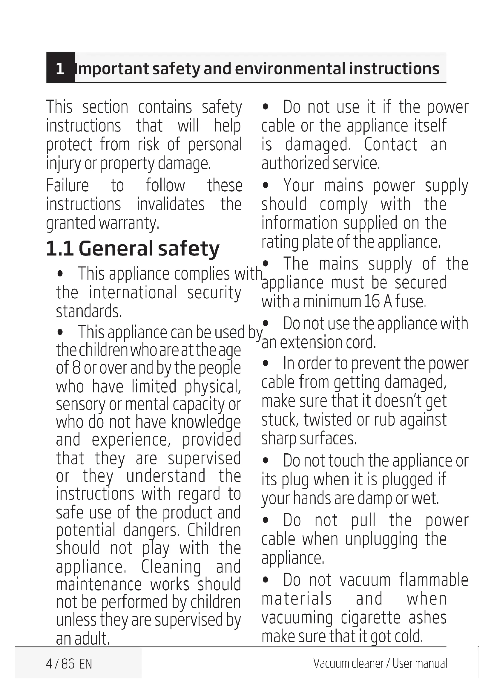 - Do not vacuum flammable materals and when vacuumng cgarette ashes make sure that t got cold. 1 Important safety and environmental instructionsVacuum cleaner / User manual 5 / 86 EN