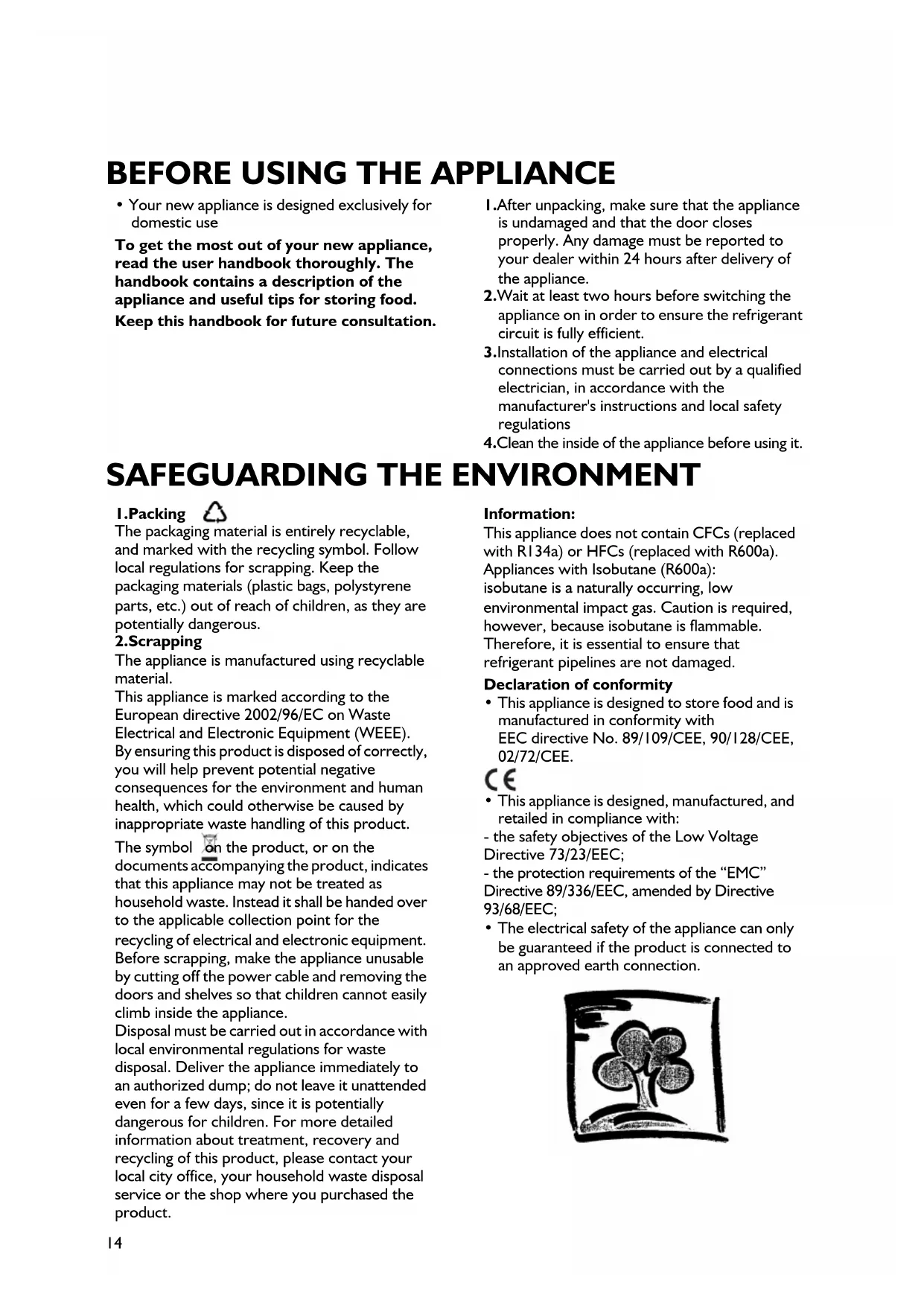 - Your new appliance is designed exclusively for domestic use To get the most out of your new appliance, read the user handbook thoroughly. The handbook contains a description of the appliance and useful tips for storing food. Keep this handbook for future consultation. 1.After unpacking, make sure that the appliance is undamaged and that the door closes properly. Any damage must be reported to your dealer within 24 hours after delivery of the appliance. 2.Wait at least two hours before switching the appliance on in order to ensure the refrigerant circuit is fully efficient. 3.Installation of the appliance and electrical connections must be carried out by a qualified electrician, in accordance with the manufacturer's instructions and local safety regulations 4.Clean the inside of the appliance before using it. 1.Packing The packaging material is entirely recyclable, and marked with the recycling symbol. Follow local regulations for scrapping. Keep the packaging materials (plastic bags, polystyrene parts, etc.) out of reach of children, as they are potentially dangerous. 2.Scrapping The appliance is manufactured using recyclable material. This appliance is marked according to the European directive 2002/96/EC on Waste Electrical and Electronic Equipment (WEEE). By ensuring this product is disposed of correctly, you will help prevent potential negative consequences for the environment and human health, which could otherwise be caused by inappropriate waste handling of this product. The symbol on the product, or on the documents accompanying the product, indicates that this appliance may not be treated as household waste. Instead it shall be handed over to the applicable collection point for the recycling of electrical and electronic equipment. Before scrapping, make the appliance unusable by cutting off the power cable and removing the doors and shelves so that children cannot easily climb inside the appliance. Disposal must be carried out in accordance with local environmental regulations for waste disposal. Deliver the appliance immediately to an authorized dump; do not leave it unattended even for a few days, since it is potentially dangerous for children. For more detailed information about treatment, recovery and recycling of this product, please contact your local city office, your household waste disposal service or the shop where you purchased the product. Information: This appliance does not contain CFCs (replaced with R134a) or HFCs (replaced with R600a). Appliances with Isobutane (R600a): isobutane is a naturally occurring, low environmental impact gas. Caution is required, however, because isobutane is flammable. Therefore, it is essential to ensure that refrigerant pipelines are not damaged. Declaration of conformity