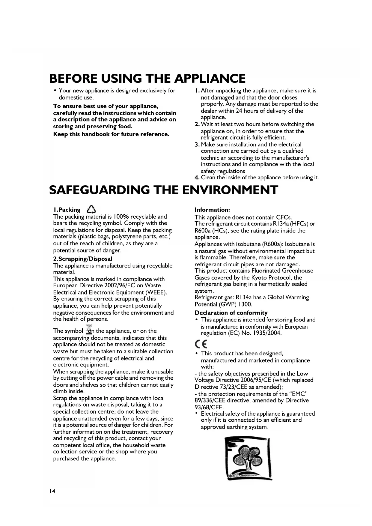 Clean the inside of the appliance before using it. 1.Packing The packing material is 100% recyclable and bears the recycling symbol. Comply with the local regulations for disposal. Keep the packing materials (plastic bags, polystyrene parts, etc.) out of the reach of children, as they are a potential source of danger. 2.Scrapping/Disposal The appliance is manufactured using recyclable material. This appliance is marked in compliance with European Directive 2002/96/EC on Waste Electrical and Electronic Equipment (WEEE). By ensuring the correct scrapping of this appliance, you can help prevent potentially negative consequences for the environment and the health of persons. The symbol on the appliance, or on the accompanying documents, indicates that this appliance should not be treated as domestic waste but must be taken to a suitable collection centre for the recycling of electrical and electronic equipment. When scrapping the appliance, make it unusable by cutting off the power cable and removing the doors and shelves so that children cannot easily climb inside. Scrap the appliance in compliance with local regulations on waste disposal, taking it to a special collection centre; do not leave the appliance unattended even for a few days, since it is a potential source of danger for children. For further information on the treatment, recovery and recycling of this product, contact your competent local office, the household waste collection service or the shop where you purchased the appliance. Information: This appliance does not contain CFCs. The refrigerant circuit contains R134a (HFCs) or R600a (HCs), see the rating plate inside the appliance. Appliances with isobutane (R600a): Isobutane is a natural gas without environmental impact but is flammable. Therefore, make sure the refrigerant circuit pipes are not damaged. This product contains Fluorinated Greenhouse Gases covered by the Kyoto Protocol, the refrigerant gas being in a hermetically sealed system. Refrigerant gas: R134a has a Global Warming Potential (GWP) 1300. Declaration of conformity