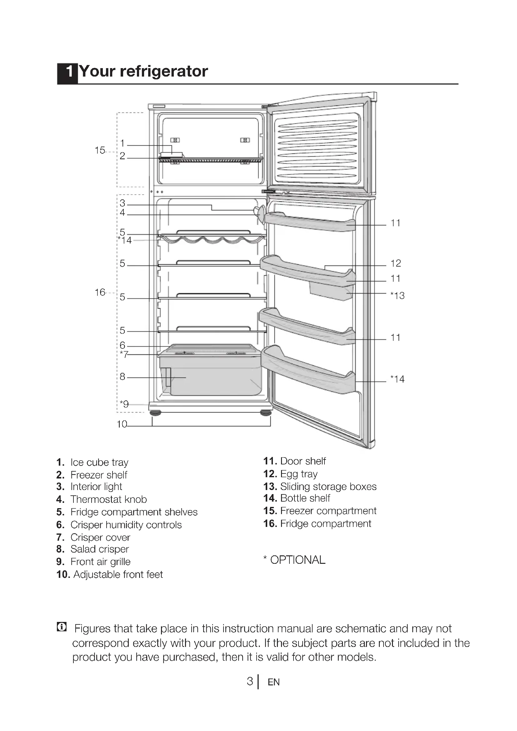 - Operate your refrigerator for 2 hours while it is empty and its doors are closed before replacing your food into the deep freezer. Using the rotary crisper (in some models) The crisper of your refrigerator which opens with a rotating movement is designed specially to provide ease of usage and allow you to store more vegetables and fruits (large volume) you buy during large shopping. When you grab and pull the handle on the lower left hand side of the crisper, it will rotate from left to right and open easily. The separator in the crisper will allow you to separate the vegetables and fruits according to their types and prevent them from crushing. Stopping your product If your thermostat is equipped with “0” position: - Your product will stop operating when you turn the thermostat button to “0” (zero) position. Your product will not start unless to you turn the thermostat button to position “1” or one of the other positions again. If your thermostat is equipped with “min” position: - Unplug your product to stop it. Making ice Fill the ice container with water and place it into its seat. Your ice will be ready approximately in two hours. You can easily remove your ice by slightly twisting the ice container.EN