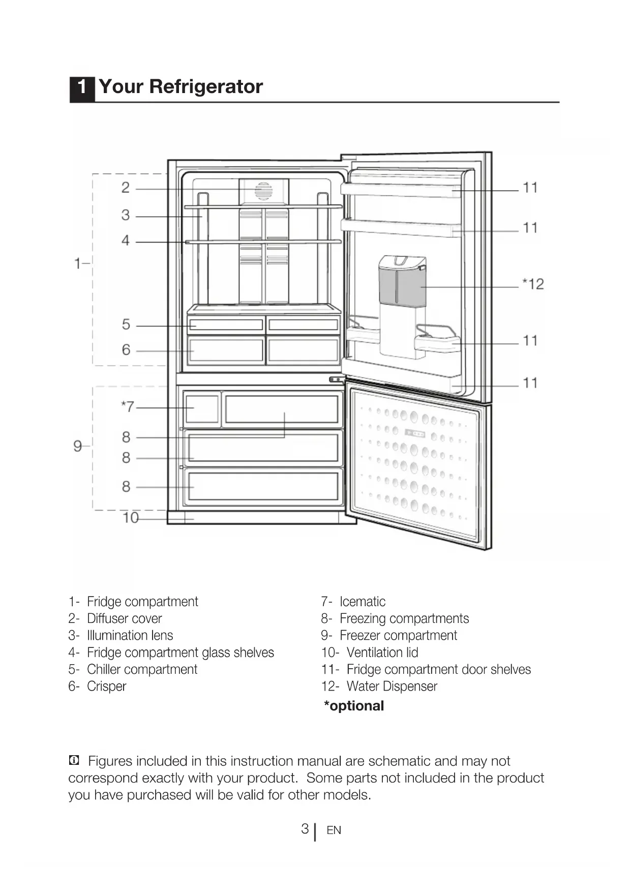 C Figures included in this instruction manual are schematic and may not correspond exactly with your product. Some parts not included in the product you have purchased will be valid for other models. 1 Your Refrigerator *optionalEN