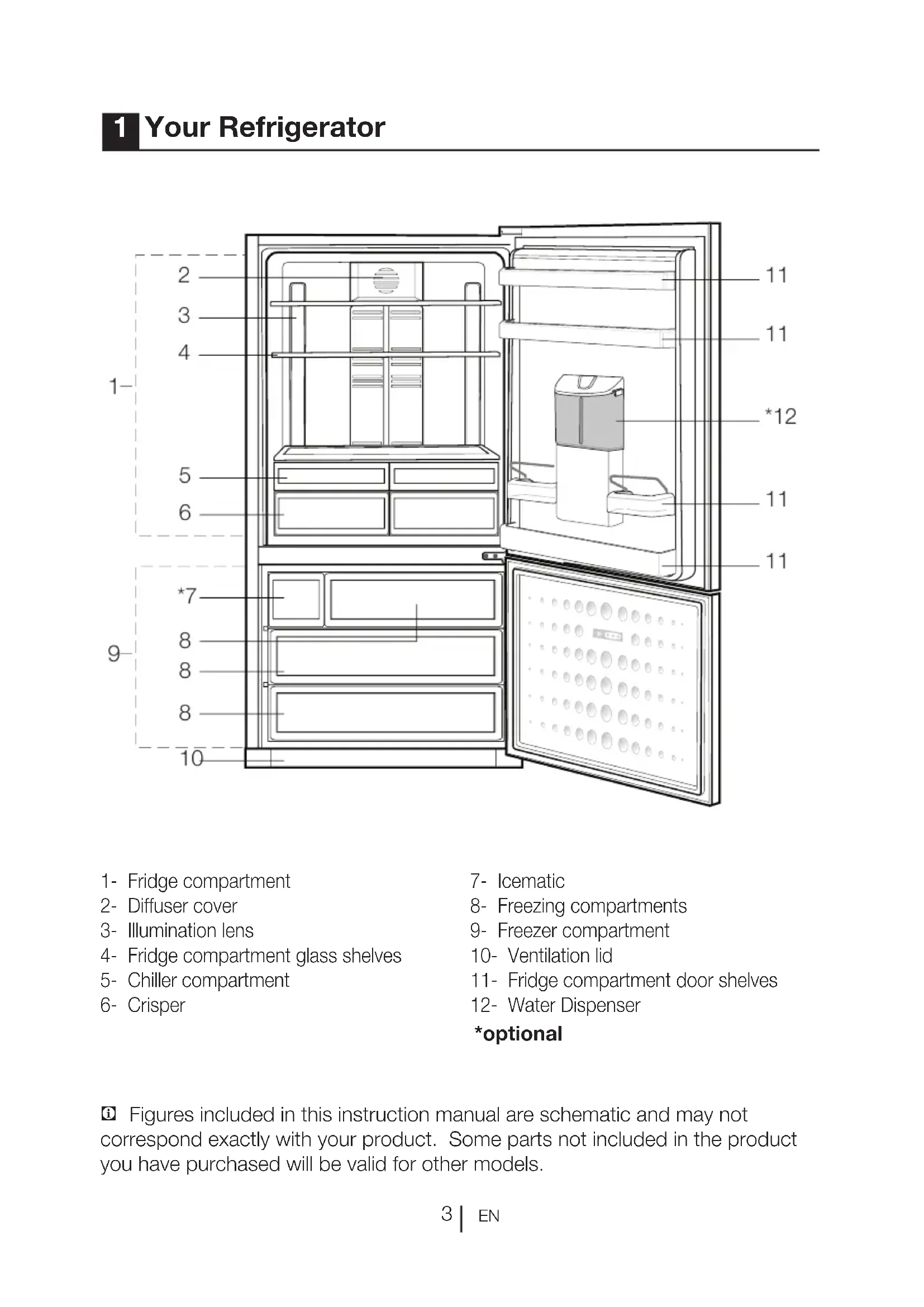 C Figures included in this instruction manual are schematic and may not correspond exactly with your product. Some parts not included in the product you have purchased will be valid for other models. 1 Your Refrigerator *optionalEN