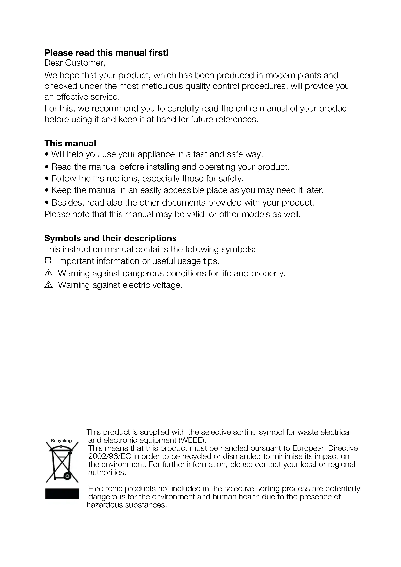 - Besides, read also the other documents provided with your product. Please note that this manual may be valid for other models as well. Symbols and their descriptions This instruction manual contains the following symbols: C Important information or useful usage tips. A Warning against dangerous conditions for life and property. B Warning against electric voltage. This product is supplied with the selective sorting symbol for waste electrical and electronic equipment (WEEE). This means that this product must be handled pursuant to European Directive 2002/96/EC in order to be recycled or dismantled to minimise its impact on the environment. For further information, please contact your local or regional authorities. Electronic products not included in the selective sorting process are potentially dangerous for the environment and human health due to the presence of hazardous substances. RecyclingEN