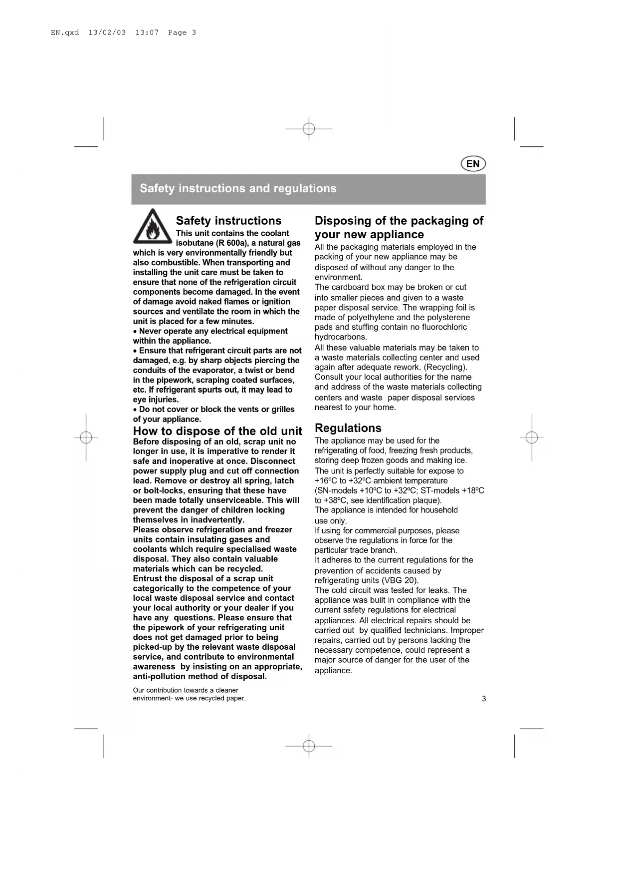 9Safety instructions and regulations Disposing of the packaging of your new appliance All the packaging materials employed in the packing of your new appliance may be disposed of without any danger to the environment. The cardboard box may be broken or cut into smaller pieces and given to a waste paper disposal service. The wrapping foil is made of polyethylene and the polysterene pads and stuffing contain no fluorochloric hydrocarbons. All these valuable materials may be taken to a waste materials collecting center and used again after adequate rework. (Recycling). Consult your local authorities for the name and address of the waste materials collecting centers and waste paper disposal services nearest to your home. Regulations The appliance may be used for the refrigerating of food, freezing fresh products, storing deep frozen goods and making ice. The unit is perfectly suitable for expose to +16ºC to +32ºC ambient temperature (SN-models +10ºC to +32ºC; ST-models +18ºC to +38ºC, see identification plaque). The appliance is intended for household use only. If using for commercial purposes, please observe the regulations in force for the particular trade branch. It adheres to the current regulations for the prevention of accidents caused by refrigerating units (VBG 20). The cold circuit was tested for leaks. The appliance was built in compliance with the current safety regulations for electrical appliances. All electrical repairs should be carried out by qualified technicians. Improper repairs, carried out by persons lacking the necessary competence, could represent a major source of danger for the user of the appliance. Safety instructions This unit contains the coolant isobutane (R 600a), a natural gas which is very environmentally friendly but also combustible. When transporting and installing the unit care must be taken to ensure that none of the refrigeration circuit components become damaged. In the event of damage avoid naked flames or ignition sources and ventilate the room in which the unit is placed for a few minutes.