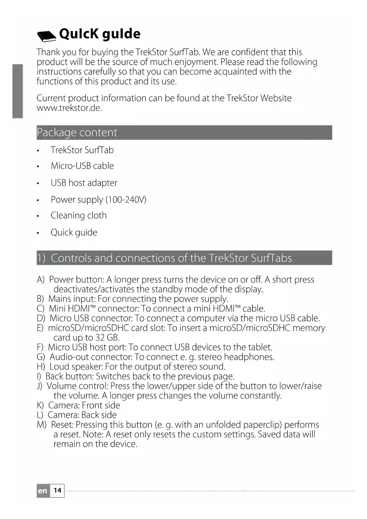 QuIcK guIde Thank you for buying the TrekStor SurfTab. We are confident that this product will be the source of much enjoyment. Please read the following instructions carefully so that you can become acquainted with the functions of this product and its use. Current product information can be found at the TrekStor Website www.trekstor.de. Package content