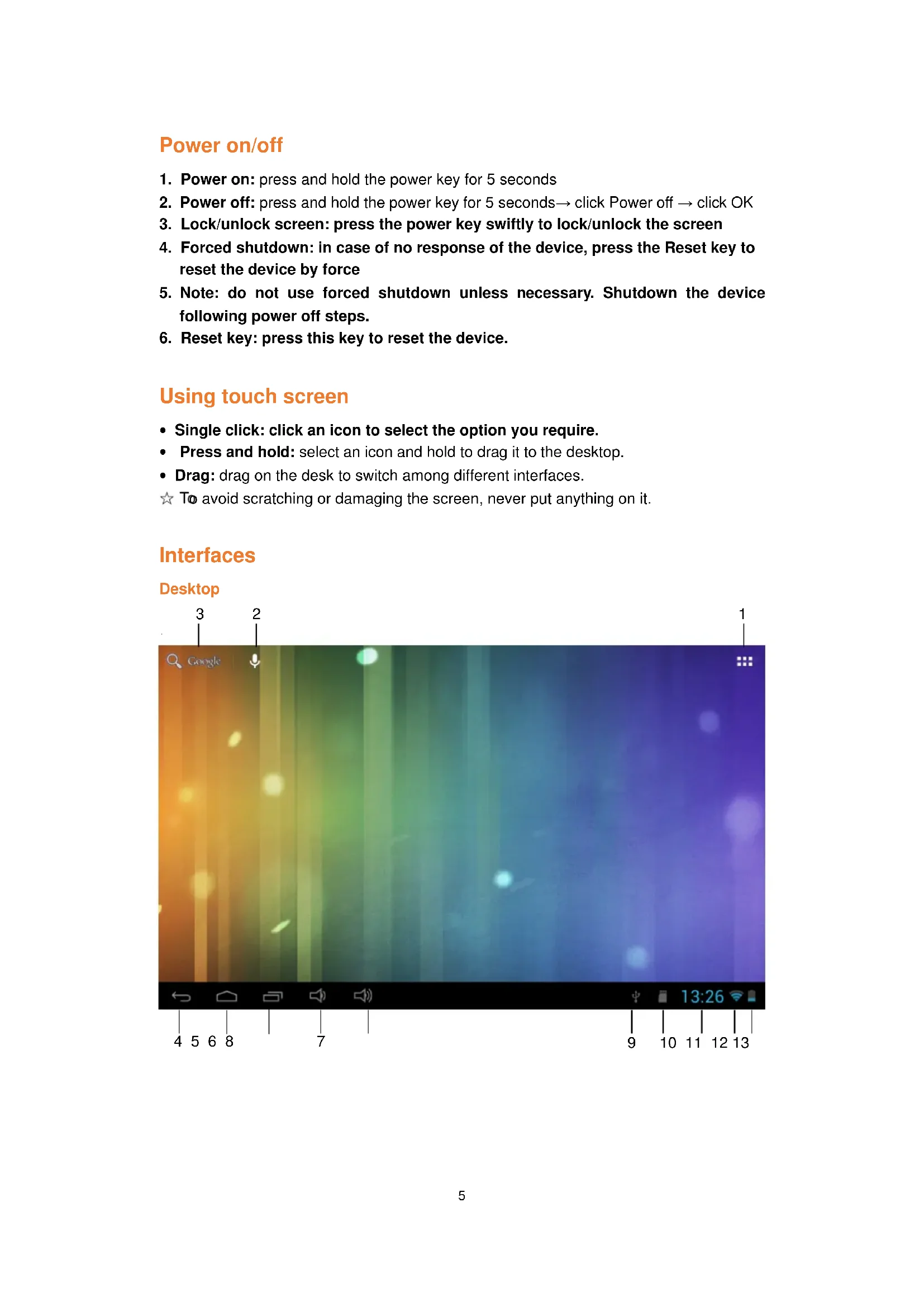 3: Google search 4: Return 5: Return to desktop 6: Select multitask 7: Volume Up 8: Volume Down 9: USB Connection indicator 10: SD card status
