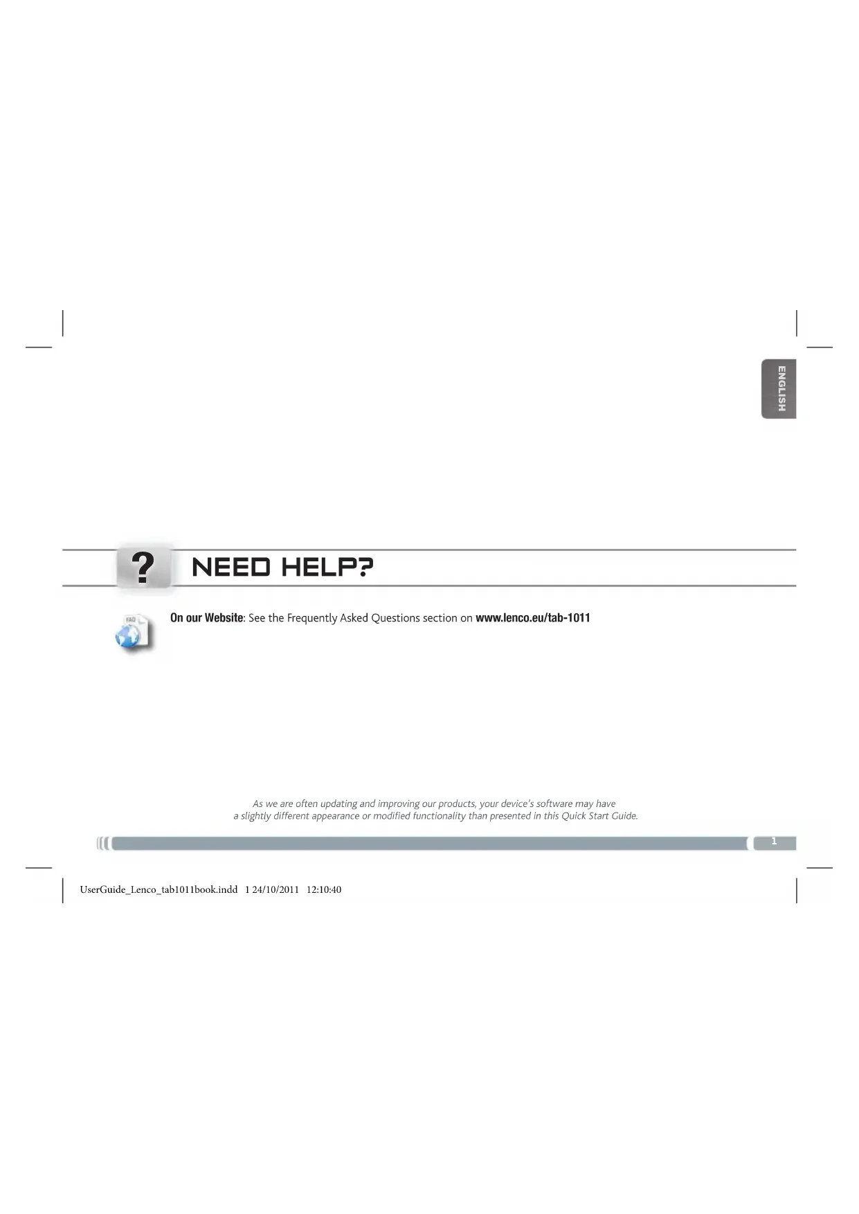 English NEED HELP? As we are often updating and improving our products, your device’s software may have a slightly different appearance or modified functionality than presented in this Quick Start Guide. On our Website: See the Frequently Asked Questions section on www.lenco.eu/tab-1011