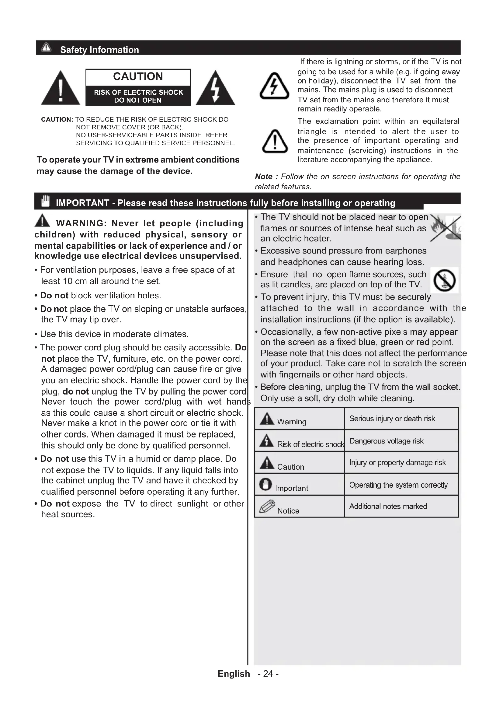 - Before cleaning, unplug the TV from the wall socket. Only use a soft, dry cloth while cleaning. Warning Serious injury or death risk Risk of electric shock Dangerous voltage risk Caution Injury or property damage risk Important Operating the system correctly Notice Additional notes marked If there is lightning or storms, or if the TV is not going to be used for a while (e.g. if going away on holiday), disconnect the TV set from the mains. The mains plug is used to disconnect TV set from the mains and therefore it must remain readily operable. The exclamation point within an equilateral triangle is intended to alert the user to the presence of important operating and maintenance (servicing) instructions in the literature accompanying the appliance. IMPORTANT - Please read these instructions fully before installing or operating Note : Follow the on screen instructions for operating the related features. To operate your TV in extreme ambient conditions may cause the damage of the device. CAUTION