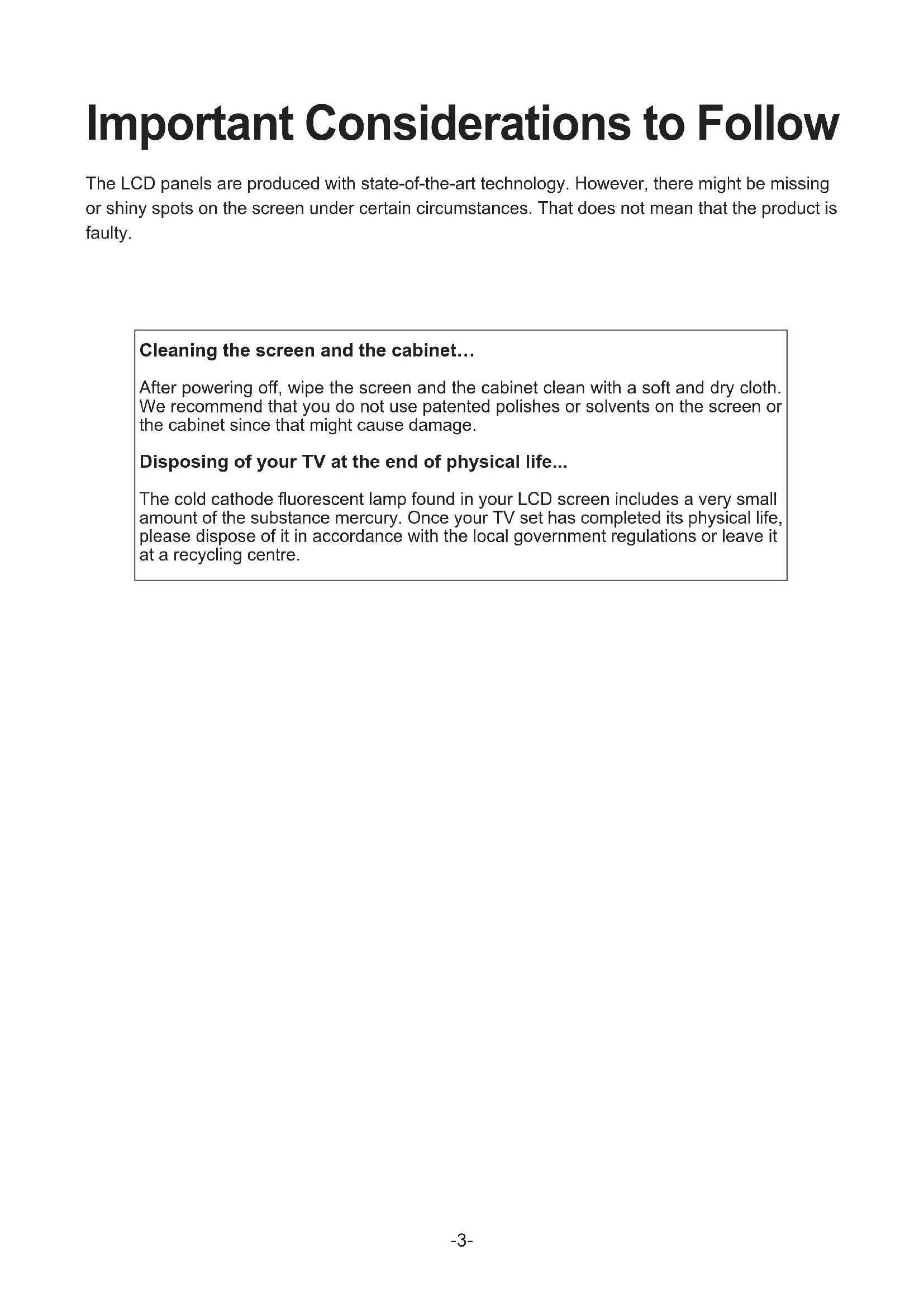 The cold cathode fluorescent lamp found in your LCD screen includes a very small amount of the substance mercury. Once your TV set has completed its physical life, please dispose of it in accordance with the local government regulations or leave it at a recycling centre.