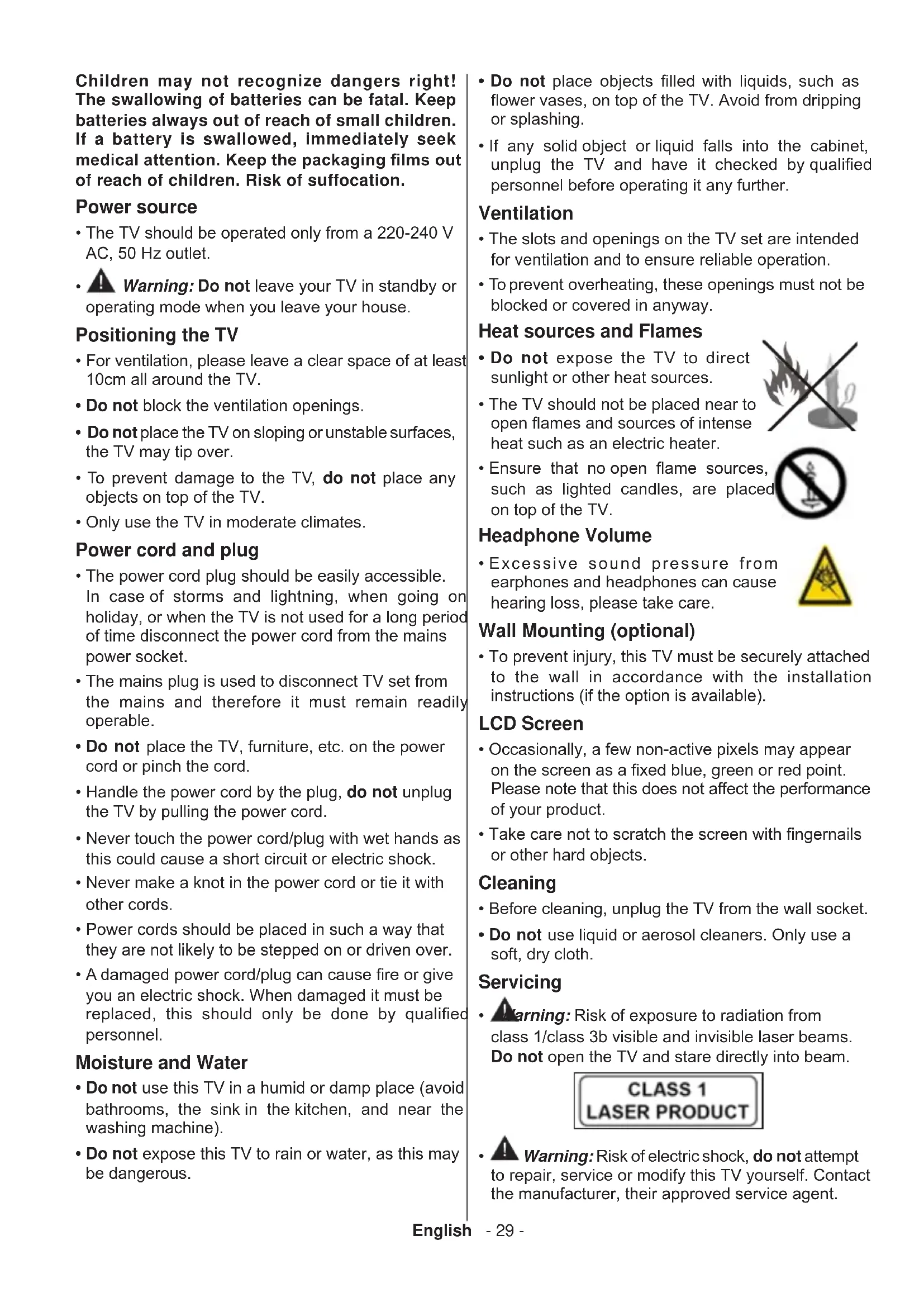 - Warning: Risk of exposure to radiation from class 1/class 3b visible and invisible laser beams. Do not open the TV and stare directly into beam.