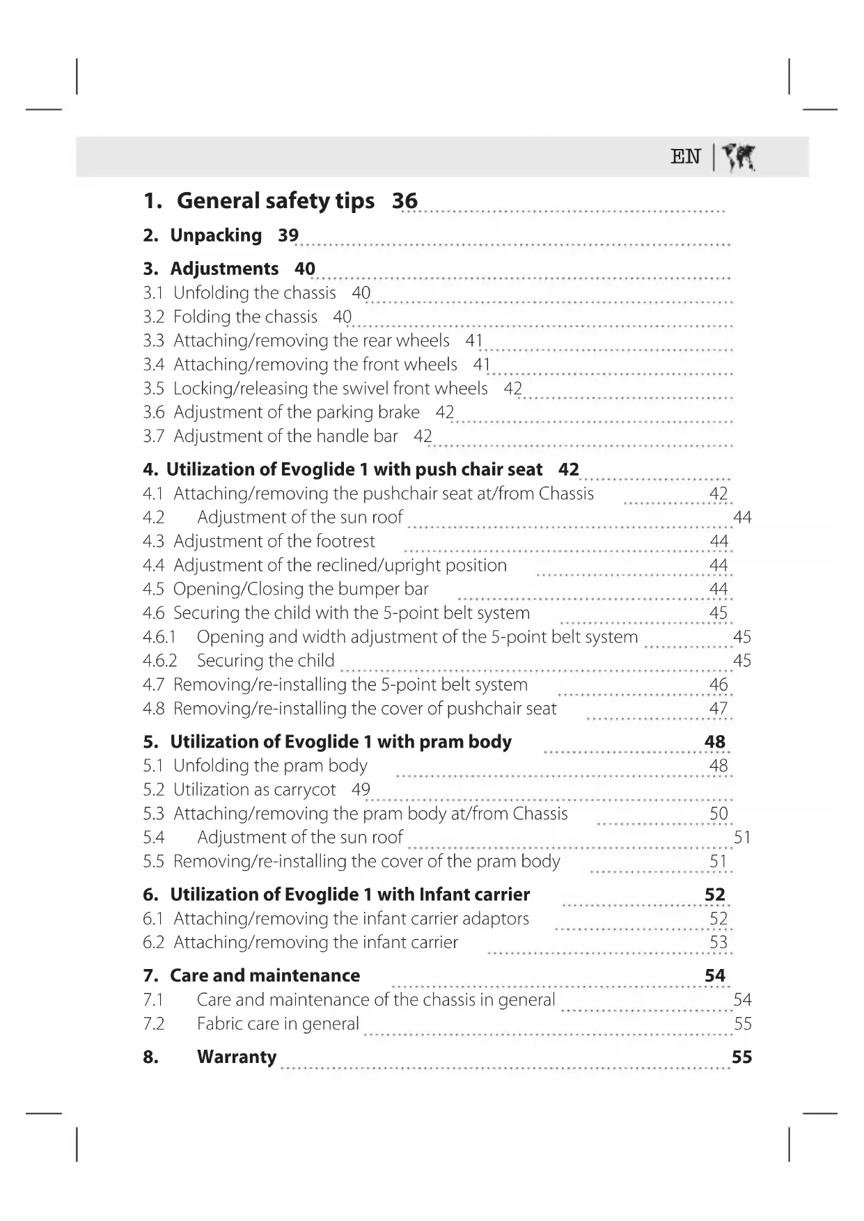 Periodically check the chassis for loose screws, rivets or worn out or defective parts. Check the fabric cover and belts for open seams or other defects. Don’t use the stroller when you noticed a defect. Defective parts have to be chan- ged or repaired before using the stroller again. After long time of usage the function elements can worsen the sliding properties. For example add some silicon oil on a cloth and rub it at gliding areas of folding mechanism (fig 48, no.1 and 2) 54EN