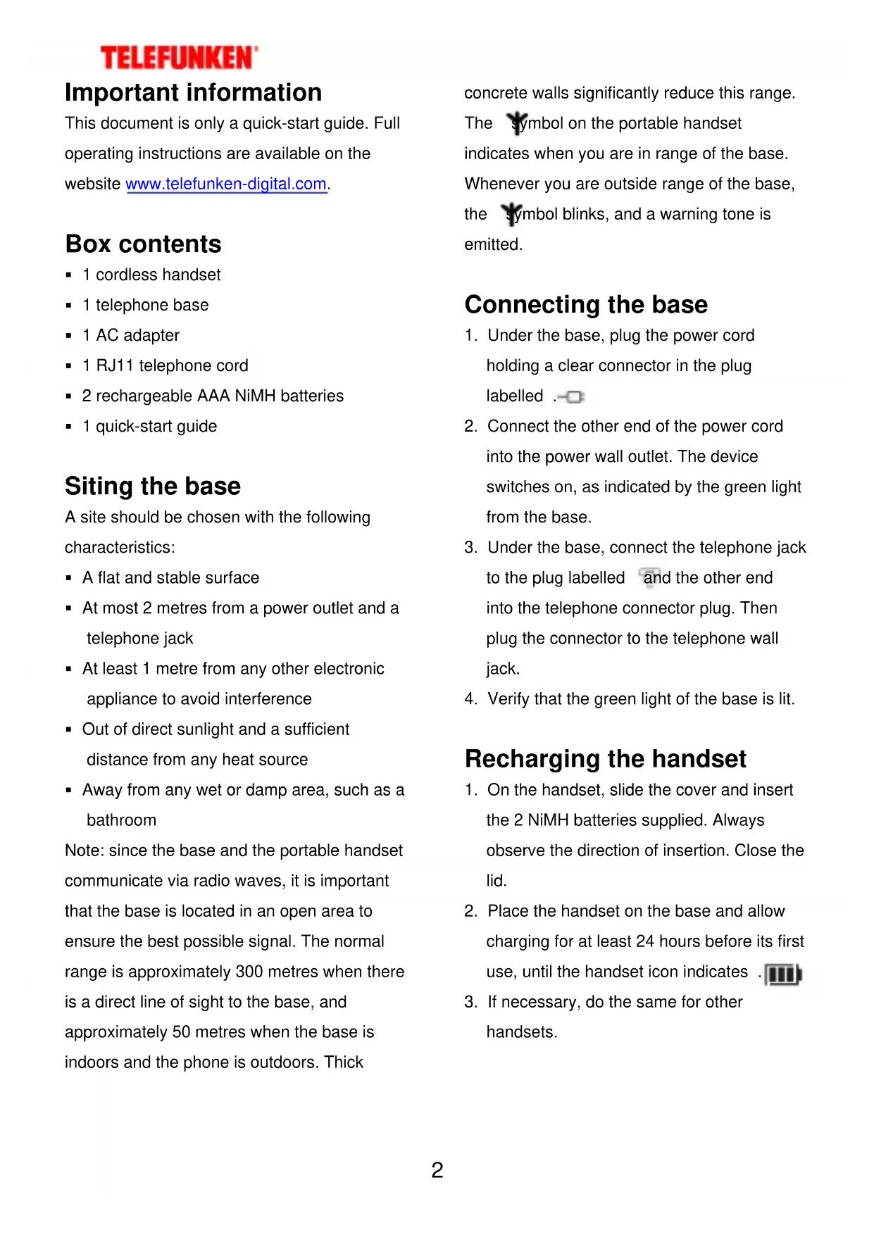 Away from any wet or damp area, such as a bathroom Note: since the base and the portable handset communicate via radio waves, it is important that the base is located in an open area to ensure the best possible signal. The normal range is approximately 300 metres when there is a direct line of sight to the base, and approximately 50 metres when the base is indoors and the phone is outdoors. Thick concrete walls significantly reduce this range. The symbol on the portable handset indicates when you are in range of the base. Whenever you are outside range of the base, the symbol blinks, and a warning tone is emitted. Connecting the base