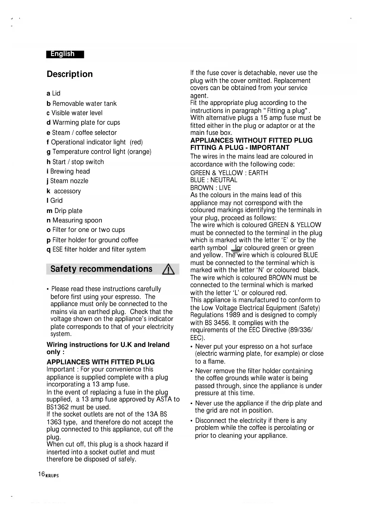 - Please read these instructions carefully before first using your espresso. The appliance must only be connected to the mains via an earthed plug. Check that the voltage shown on the appliance’s indicator plate corresponds to that of your electricity system. Wiring instructions for U.K and Ireland only :