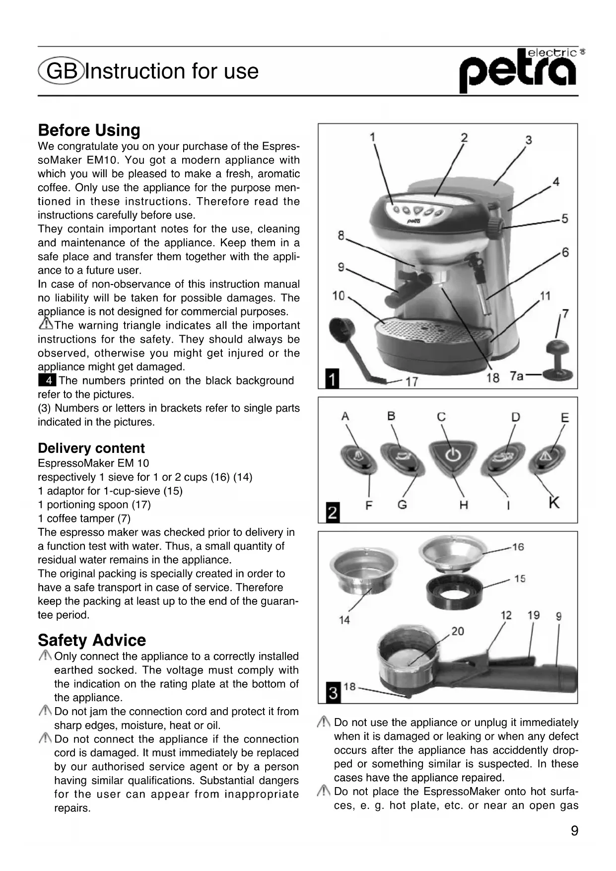 erhalten Sie im ausgewähl- ten Fachhandel. In einer Packungsgröße, die zwei Portionen à 125 ml enthält, können Sie ihn auch bei petra-electric bestellen. Eine Portion ist auf eine vollständige Ent- kalkung abgestimmt9 Before Using We congratulate you on your purchase of the Espres- soMaker EM10. You got a modern appliance with which you will be pleased to make a fresh, aromatic coffee. Only use the appliance for the purpose men- tioned in these instructions. Therefore read the instructions carefully before use. They contain important notes for the use, cleaning and maintenance of the appliance. Keep them in a safe place and transfer them together with the appli- ance to a future user. In case of non-observance of this instruction manual no liability will be taken for possible damages. The appliance is not designed for commercial purposes. The warning triangle indicates all the important instructions for the safety. They should always be observed, otherwise you might get injured or the appliance might get damaged. 4 The numbers printed on the black background refer to the pictures. (3) Numbers or letters in brackets refer to single parts indicated in the pictures. Delivery content EspressoMaker EM 10 respectively 1 sieve for 1 or 2 cups (16) (14) 1 adaptor for 1-cup-sieve (15) 1 portioning spoon (17) 1 coffee tamper (7) The espresso maker was checked prior to delivery in a function test with water. Thus, a small quantity of residual water remains in the appliance. The original packing is specially created in order to have a safe transport in case of service. Therefore keep the packing at least up to the end of the guaran- tee period. Safety Advice Only connect the appliance to a correctly installed earthed socked. The voltage must comply with the indication on the rating plate at the bottom of the appliance. Do not jam the connection cord and protect it from sharp edges, moisture, heat or oil. Do not connect the appliance if the connection cord is damaged. It must immediately be replaced by our authorised service agent or by a person having similar qualifications. Substantial dangers for the user can appear from inappropriate repairs. Do not use the appliance or unplug it immediately when it is damaged or leaking or when any defect occurs after the appliance has acciddently drop- ped or something similar is suspected. In these cases have the appliance repaired. Do not place the EspressoMaker onto hot surfa- ces, e. g. hot plate, etc. or near an open gas GB Instruction for use10 flame, the housing might melt. Surfaces sensitive to water are not suitable as they might be dama- ged by water splashes. Scalding danger due to hot water or steam. Never place the steam resp. hot water nozzle to the body direction. During the brewing, never try to remove the sieve holder. Never switch on the appliance if the water contai- ner is not placed. Switch off the appliance prior to detaching the water container. Scalding danger! During the operation, some parts of the EspressoMaker will become very hot. Avoid direct body contact with the hot compo- nents. During the operation, always use the han- dles and buttons designed for this purpose. Pay attention that children do not have the oppor- tunity to play with the appliance. Disconnect the appliance if it is not used for lon- ger time. Danger of frost! Since you already taken the appliance into operation, i.e. filled it with water, it may only be used and stored in frost-free rooms. Otherwise the appliance might get damaged. Usage With the EspressoMaker, you can prepare 1 or 2 cups of espresso within very short time. The pressure of 15 bar ensures a rich crema. You can use every usual coffee sort. There are special coffee sorts for espresso machines. Just try different sorts in order to find out your favourite. You can use the coffee freshly ground or as coffee soft pods (hard pods with a dia- meter of 45 mm or soft pods with a diameter of up to 70 mm). On the pre-warming plate (2), you can warm up the cups in order to enjoy the coffee with an optimum temperature. With the swivelling hot-water / steam nozzle (6), you can froth up milk, warm up liquids or prepare hot water. Putting into operation Place the appliance onto a stable and water-resistant surface. Prior to first use it is recommended to clean the water container (4), the sieve holder (9) with sieve attach- ments (14) (16) and the adapter (15) with washing-up liquid and rinse it with clean water afterwards. It is not allowed to press the ON / OFF button (C) before you have not bled it as described as follows. Vent / Rinsing Prior to first operation of the EspressoMaker, or when it is not used for a longer time, it has to be vent resp. rinsed prior to switching on. For this purpose, make ready a collecting bowl which has a capacity of at least 700 ml. Take out the water container (4) at the handle from the insert, and open the lid (3) in order to fill in water. Only fill cold fresh water in it, never carbonated water or another liquid, e. g. milk etc. If filled up to the max marking, the capacity is suffi- cient for approx. 20 cups à 35 ml/each. Place back the water container (4) into the insert in the appliance and firmly press it downwards. Connect the connection cord into an earthed socket and open the steam valve (5) by rotating the tur- ning knob counter clockwise. Now push the rinsing button (E). The pump works audibly and the readiness for brewing illuminates (K). As soon as some water came out from the hot water/steam nozzle (6) into the collecting bowl, close the steam valve (5) and place the collecting bowl under the brewing head (8). After the system has been filled completely, the appliance switches off automatically. Heating up Firstly place the adaptor (15) into the sieve hol- der (9) and afterwards place the one-cup-sieve (16). Place the 2-cups-sieve (14) into the sieve hol- der (9). The sieves must be placed exactly in the position shown in picture 4 , i.e. the markings must