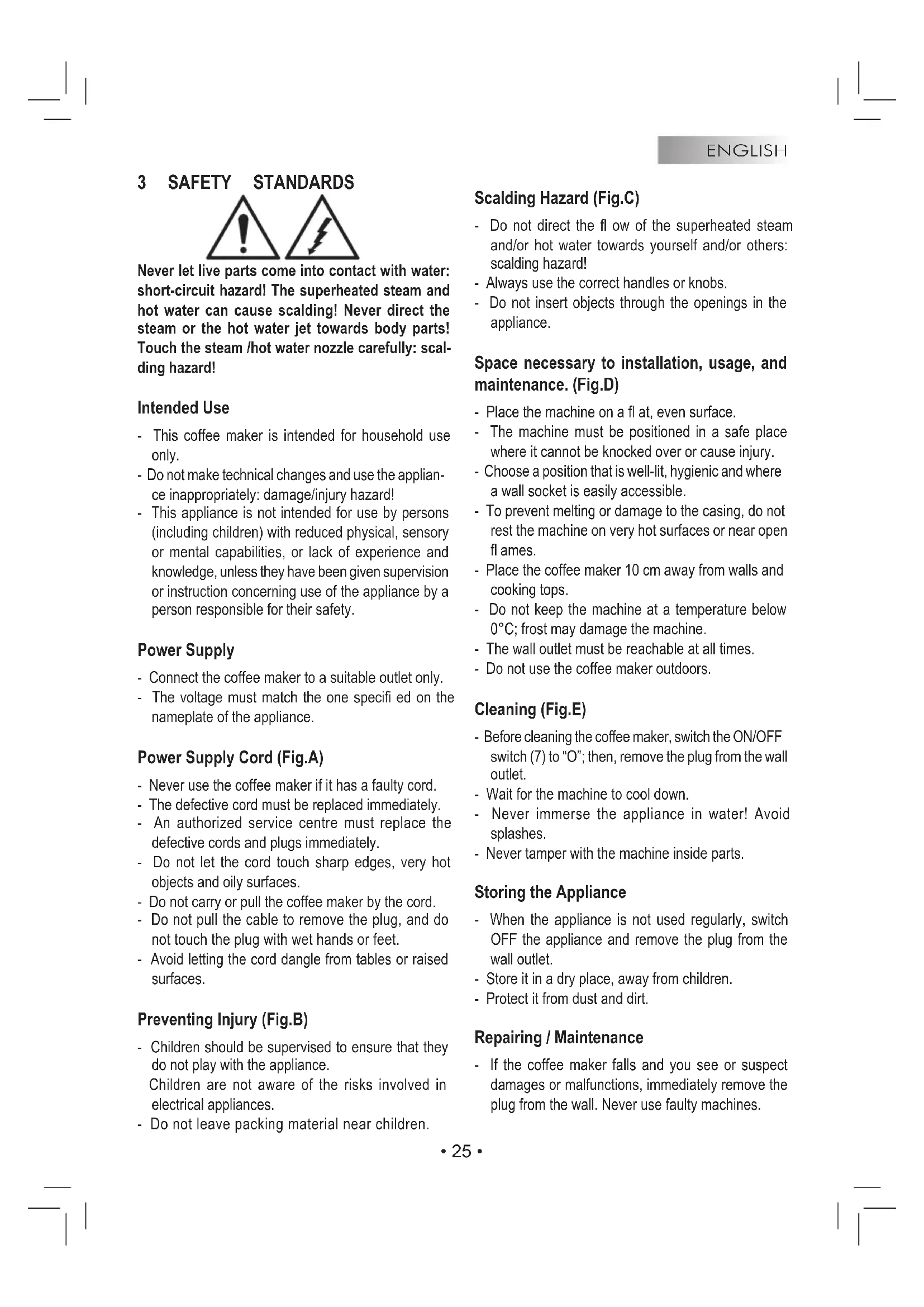 - 25 • 3 SAFETY STANDARDS Never let live parts come into contact with water: short-circuit hazard! The superheated steam and hot water can cause scalding! Never direct the steam or the hot water jet towards body parts! Touch the steam /hot water nozzle carefully: scal- ding hazard! Intended Use - This coffee maker is intended for household use only. - Do not make technical changes and use the applian- ce inappropriately: damage/injury hazard! - This appliance is not intended for use by persons (including children) with reduced physical, sensory or mental capabilities, or lack of experience and knowledge, unless they have been given supervision or instruction concerning use of the appliance by a person responsible for their safety. Power Supply - Connect the coffee maker to a suitable outlet only. - The voltage must match the one specifi ed on the nameplate of the appliance. Power Supply Cord (Fig.A) - Never use the coffee maker if it has a faulty cord. - The defective cord must be replaced immediately. - An authorized service centre must replace the defective cords and plugs immediately. - Do not let the cord touch sharp edges, very hot objects and oily surfaces. - Do not carry or pull the coffee maker by the cord. - Do not pull the cable to remove the plug, and do not touch the plug with wet hands or feet. - Avoid letting the cord dangle from tables or raised surfaces. Preventing Injury (Fig.B) - Children should be supervised to ensure that they do not play with the appliance. Children are not aware of the risks involved in electrical appliances. - Do not leave packing material near children. Scalding Hazard (Fig.C) - Do not direct the fl ow of the superheated steam and/or hot water towards yourself and/or others: scalding hazard! - Always use the correct handles or knobs. - Do not insert objects through the openings in the appliance. Space necessary to installation, usage, and maintenance. (Fig.D) - Place the machine on a fl at, even surface. - The machine must be positioned in a safe place where it cannot be knocked over or cause injury. - Choose a position that is well-lit, hygienic and where a wall socket is easily accessible. - To prevent melting or damage to the casing, do not rest the machine on very hot surfaces or near open fl ames. - Place the coffee maker 10 cm away from walls and cooking tops. - Do not keep the machine at a temperature below 0°C; frost may damage the machine. - The wall outlet must be reachable at all times. - Do not use the coffee maker outdoors. Cleaning (Fig.E) - Before cleaning the coffee maker, switch the ON/OFF switch (7) to “O”; then, remove the plug from the wall outlet. - Wait for the machine to cool down. - Never immerse the appliance in water! Avoid splashes. - Never tamper with the machine inside parts. Storing the Appliance - When the appliance is not used regularly, switch OFF the appliance and remove the plug from the wall outlet. - Store it in a dry place, away from children. - Protect it from dust and dirt. Repairing / Maintenance - If the coffee maker falls and you see or suspect damages or malfunctions, immediately remove the plug from the wall. Never use faulty machines.ENGLISH