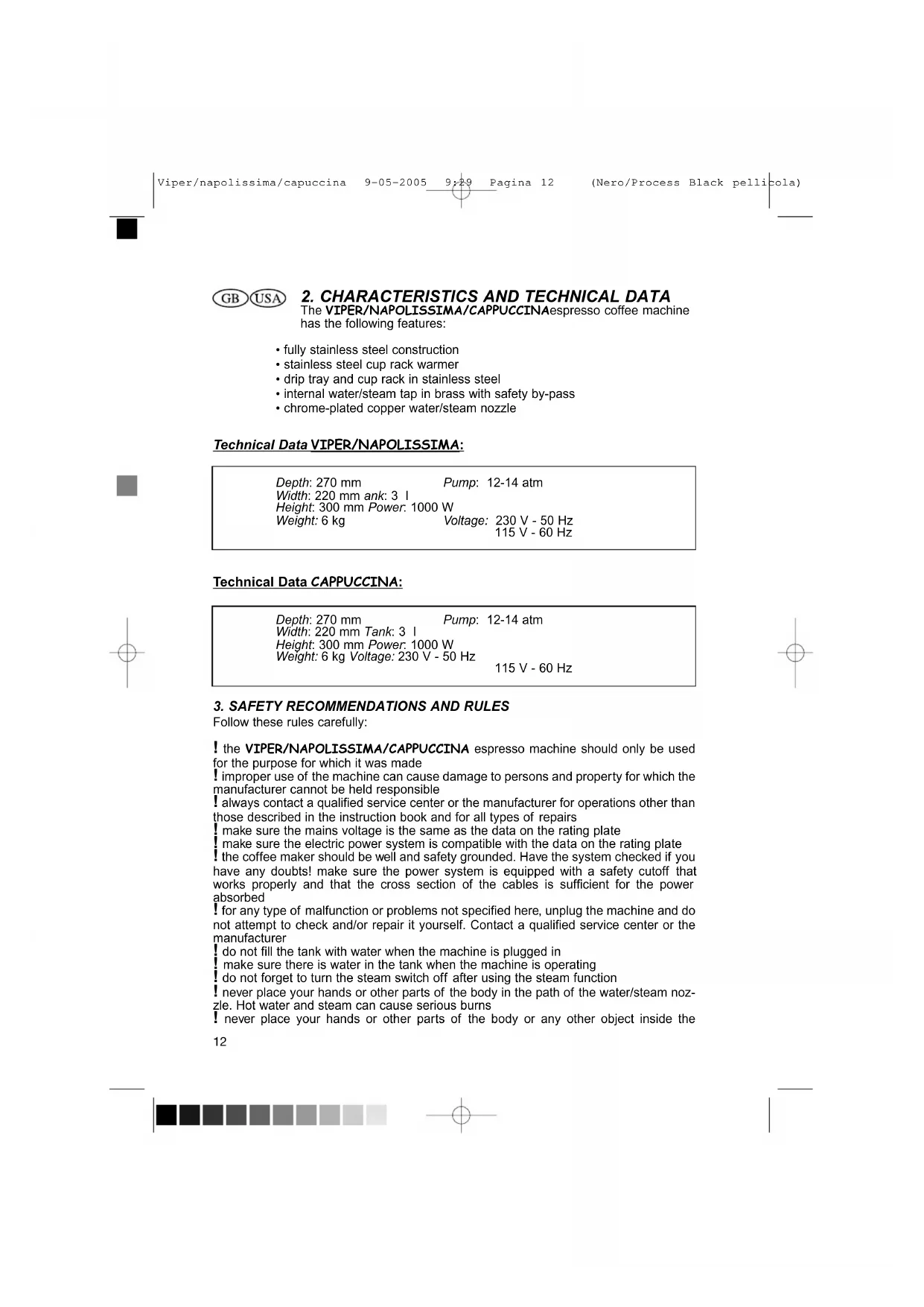 Follow these rules carefully: ! the VIPER/NAPOLISSIMA/CAPPUCCINA espresso machine should only be used for the purpose for which it was made ! improper use of the machine can cause damage to persons and property for which the manufacturer cannot be held responsible ! always contact a qualified service center or the manufacturer for operations other than those described in the instruction book and for all types of repairs ! make sure the mains voltage is the same as the data on the rating plate ! make sure the electric power system is compatible with the data on the rating plate ! the coffee maker should be well and safety grounded. Have the system checked if you have any doubts! make sure the power system is equipped with a safety cutoff that works properly and that the cross section of the cables is sufficient for the power absorbed ! for any type of malfunction or problems not specified here, unplug the machine and do not attempt to check and/or repair it yourself. Contact a qualified service center or the manufacturer ! do not fill the tank with water when the machine is plugged in ! make sure there is water in the tank when the machine is operating ! do not forget to turn the steam switch off after using the steam function ! never place your hands or other parts of the body in the path of the water/steam noz- zle. Hot water and steam can cause serious burns ! never place your hands or other parts of the body or any other object inside the Viper/napolissima/capuccina 9-05-2005 9:29 Pagina 12 (Nero/Process Black pellicola)13 machine when it is plugged in ! never touch the machine with wet hands or feet ! never touch the hot parts of the machine (bottom of coffee distributor and water/steam nozzles) ! before performing any routine maintenance make sure the machine is unplugged, with- out pulling the power cable, or that the main circuit breaker is off ! if the power cable should be damaged and have to be replaced, order a new cable from the manufacturer and/or its service center ! never immerse the coffee machine in any type of liquid ! do not use detergents or abrasive substances to clean the machine ! do not leave the machine exposed to atmospheric agents ! do not leave the machine within reach of children or people who are not capable of using it ! keep the coffee maker away from any heat sources